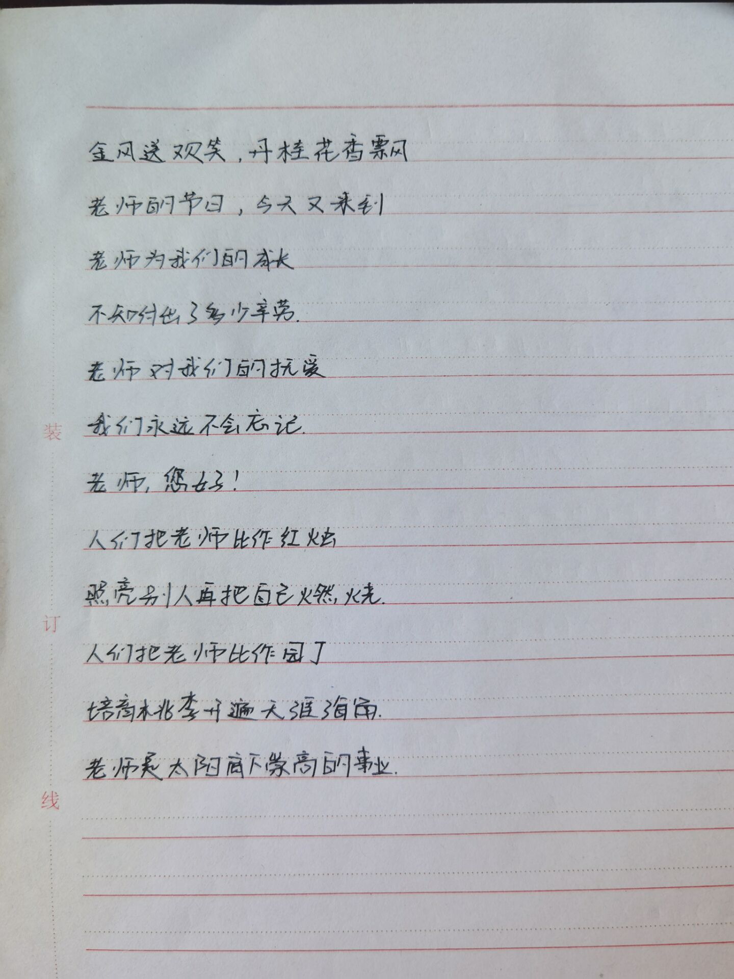“那一支白色的笔,绘下了无数个未来。人生没有送分题,好在您曾教过标准答案。一桌一讲台,一师一生情。”、“学生的懵懂,有老师会消除,黑板的斑驳,有板擦会抹去。您的烦恼,有我来为你驱赶”、“师者,传道受业解惑也”、“三人行,则必有我师焉” ……一首首三行情诗、一句句手抄古代经典名言名句,对老师的拳拳感激之情在笔墨中流淌。 “把这一点讲完,我们马上下课”、“同学们,不要让我划重点,课上我讲的都是重点”、“看看工程班的同学,他们班作业写得多好多整齐”……同学们你一言我一语,回忆起老师们的口头禅,忍不住笑出声来。