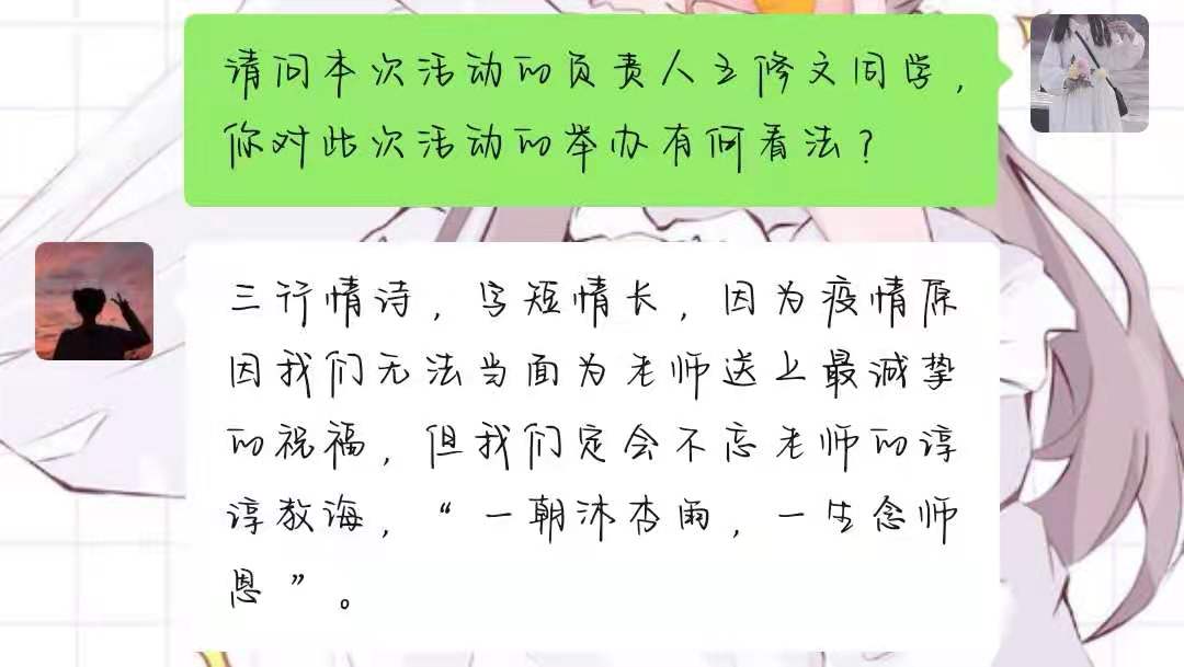 本次活动的负责人王修文同学表示:“三行情诗,字短情长,因为疫情原因我们无法当面为老师送上最诚挚的祝福,但我们定会不忘老师的谆谆教诲,'一朝沐杏雨,一生念师恩。”