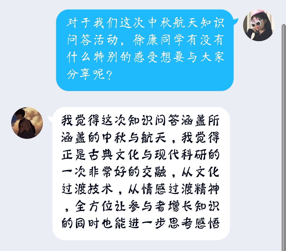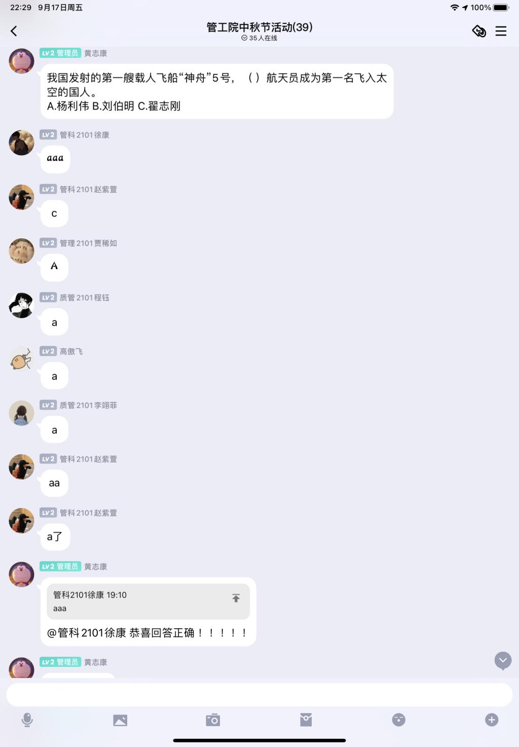 管理2102徐康同学也表示:“这次知识问答涵盖了中秋与航天两个主题,我觉得正是古典文化与现代科技的一次非常好的碰撞交融,从文化过渡到技术,从情感过渡到精神,让参与者增长知识的同时也能进一步思考感悟。”