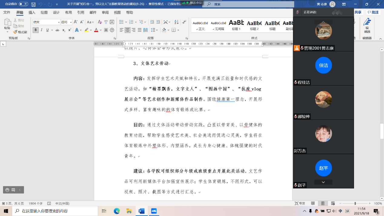 “一个人能在劳动的物质成果中体现他的智慧、技艺、对事业的无私热爱和自己的荣誉、自尊,能为自己的成果而自豪。”、“只有劳动才能使人尊严的活着,劳动对每个人来说不仅是一般意义上的生存需要,而是体现一个人生命的价值,任何劳动都会受人尊重。”……同学们热火朝天地讨论着关于劳动的名人名言,交流着自己关于劳动的看法。“今天我要做一道麻婆豆腐”、“今天我要给家里进行一次大扫除”……管理2001班组织了线上班会,会后,同学们热情高涨,在家成为了劳动小能手。