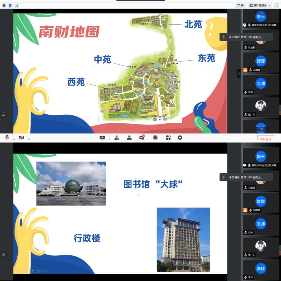 接着,金美玉学姐结合图片带领新生们游览了南财的地图和特色建筑,讲解了学习成绩评定的方法、奖学金评定的条件等,并鼓励新生结合特长爱好参加社团、多参加竞赛锻炼自己,发展兴趣爱好,结交志同道合的朋友,让大学生活多姿多彩。