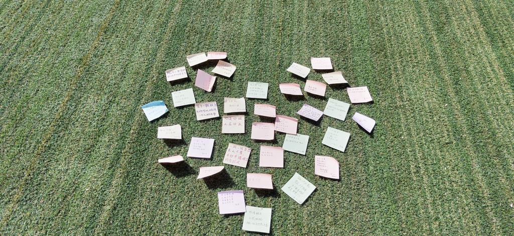 另一边,同学们用五谷杂粮开始一场“世界粮食日”原生态的拼字活动,大家把布铺在草坪上,你一言我一语地讨论构思,从最普通的原材料入手,从粮食本源出发,用一粒粒大米、一颗颗红豆、黄豆、黑豆开始拼字,堆积、铺开、调整……慢慢地“世界粮食日”几个字浮现在眼前,造型朴实无华,意味深长。