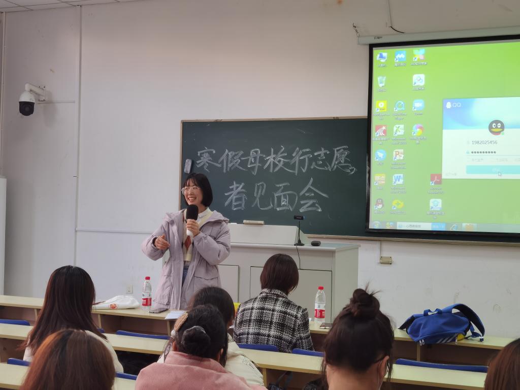 视频结束后,党总支副书记孙启老师上台为同学们分析了学校的招生政策,她提到:“寒假的母校行志愿活动是回到高中母校向弟学妹们宣讲南财历史、办学理念、学科优势、专业特色、校园文化等情况,这不仅仅是为提升南财的社会影响力和美誉度,更是希望通过介绍吸引更多的同学报考南财。”