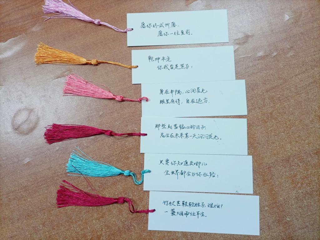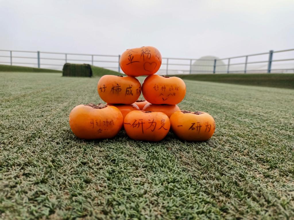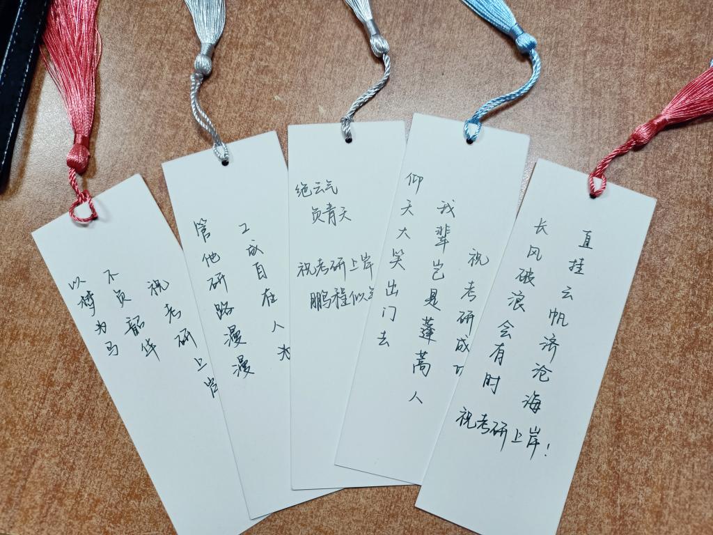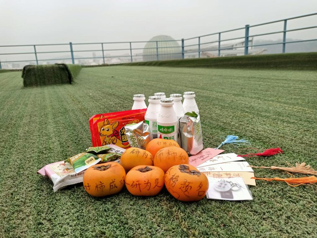 小礼包蕴涵着大温暖大祝福:两个柿子、一袋花生,寓意“好事发生”、“好事成双”;一包青豆,一包鲜花饼,希望学子们艰辛复习,可以“种花得花,种豆得豆”;“平安喜乐,万事顺意”亚克力钥匙扣,祈祷学子们研途风雨,明岸相逢,开启新的人生征程;冬日里软萌可爱的的暖宝宝,让考研学子考试时身心皆暖;大瓶AD钙奶,让考研学子补充能量,元气满满地备战考试……最别出心裁的还是柿子上写下的鼓励的文字或画上的笑脸、爱心等符号,还有学弟学妹们为考研学子亲手书写的祝福书签,一笔一画,一字一句,都承载着对学长学姐最真挚的祝愿,希望他们能顺利上岸,金榜题名。