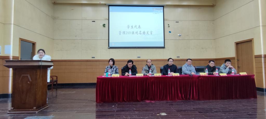 随后,新生代表管理2101班刘名赫同学发言。她将学院比作承载梦想的码头,将所学专业比作船帆,将三位系主任比作船长,将每一位优秀的老师比作水手,她说我们要自我管理,努力学习知识,合理规划未来,坚持扬帆远航。