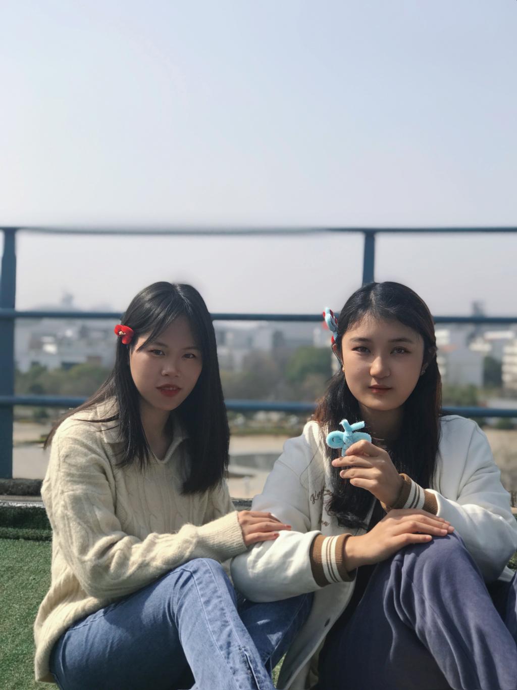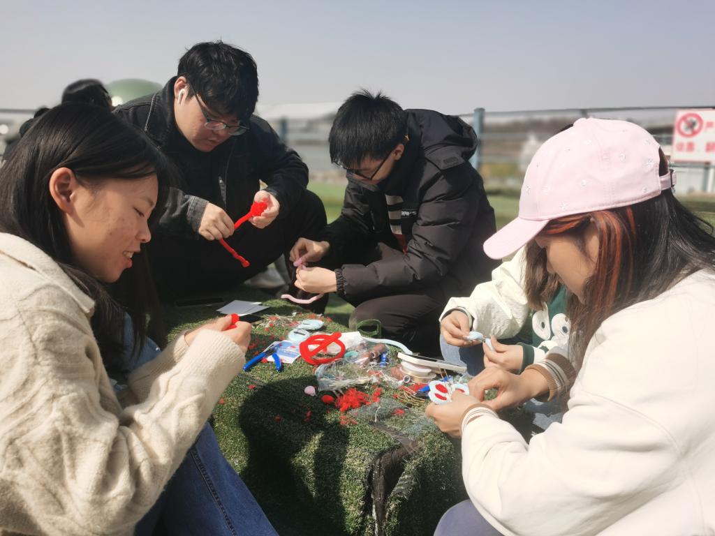毛绒绒的细线在女生们的手中来回穿梭,一环套一环,一圈绕一圈,阳光打在身上,光阴交错,一幅岁月静好的模样。男生们在旁边细致地观察,耐心地学习,时不时地也会问上一句“下一步呢?搭配什么颜色好呢?”小红梅、粉蔷薇、蓝蝴蝶……慢慢地,一朵朵精美绝伦的绒花逐渐呈现在大家眼前。这些男生女生一起完成的绒花,有的被插上女生耳旁,有的被拿在手上把玩着,学校德济楼五楼草坪现场不时传出一阵阵欢声笑语。这是3月3日中午williamhill英国“女生如花”妇女节主题活动现场,男生学习制作江苏省非物质文化遗产,向女生献礼,向中国传统文化致敬。