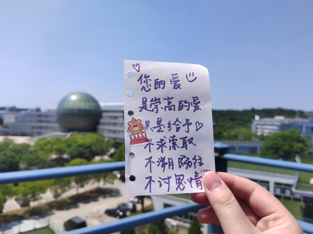 “有您的地方最幸福,妈妈的爱像月光,慈祥又温柔”“想时光慢一点,爱您再多一点”“缓慢又笨拙的路上,谢谢您陪我长大”“感谢你不是超人,却为我变成了无所不能” “愿您是永远幸福快乐的少女,愿您永远年轻永远童真”……同学们拿着纸笔,低头沉思,在现场认真制作精美手账,一朵小花、一株小草、一只小鸟、一条小狗、一杯热气腾腾的奶茶、一块香气扑鼻的面包、一件亲手织好的毛衣、一个扎着辫子的小姑娘、一个戴着帽子的小男孩……同学们画下了从小到大母亲和自己的日常。一笔一划凝聚着无限的感恩与祝福,一物一一张张手账纸上寄托着满满的爱与深情。他们用简短但动情的话语,向母亲表达内心真挚的爱意。“有时候我们不太擅长直接表达自己的爱意,但是通过做手帐这种方式,把自己的情感寄托于纸上,这让我们更加敢于把爱说出来。”参加这次活动的质管2101张雨姗同学说道。