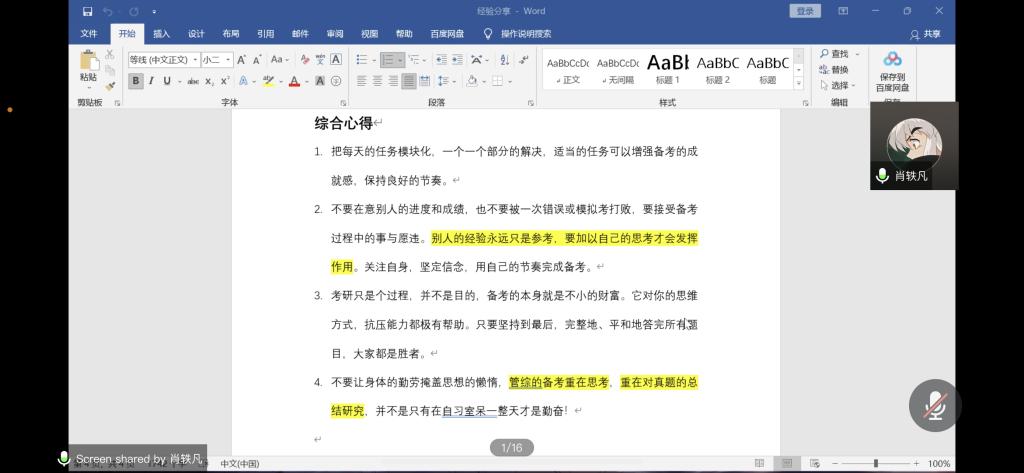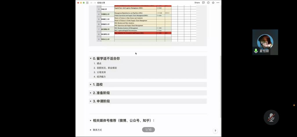 肖轶凡针对管综考研展开分享。他为管综备考内容和备考要点进行了清晰地讲解,表示数学、逻辑和写作是三个备考重点,此外,他还总结了自己考研的心得。夏恒薪从“留学是否适合你”到“选校”再到“准备阶段”最后到“申请阶段”为我们进行了留学方面的讲解。吴一凝针对管综考研进行分享,从考试特点、择校问题、考试科目、初试和复试几个方面展进行细致地讲解,最后,她提醒同学们要保持良好的心态,自信坦然地灵活应变,注重当下,慎看经验贴,学会合作,不要放弃。黄翔宇成功考取了华东理工大学,他对该校历年录取分数线、2022年考研的具体情况和2022专业课大纲进行了分析比较,推荐专业课参考书目的同时,还总结了命题规律,从各科角度介绍了复习规划。