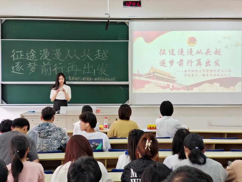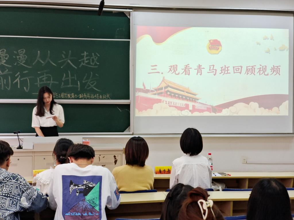 接着,大家一起观看了青马班回顾视频,回忆了学员们一起成长的点点滴滴。随后,学员代表蒋丙晨同学上台发言。他表示,青马班通过志愿服务、交流讨论和观影等多种方式等,提升了同学们的思想政治素质、政策理论水平、创新能力、实践能力和组织协调能力,收获颇丰,感谢每一位青马班成员的陪伴。