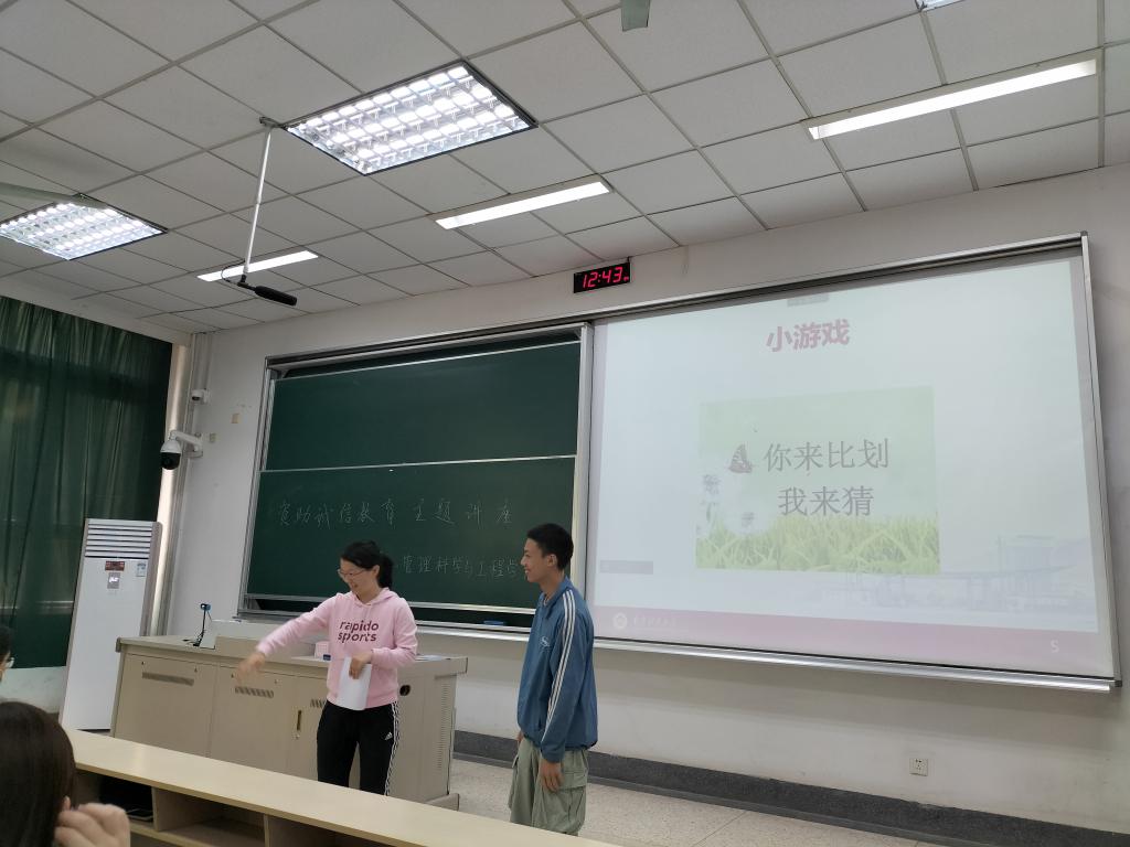 沙敏老师通过三鹿奶粉事件、老坛酸菜事件和韩信报恩等诚信小故事导入,开始讲解,明确了诚信的重要性。之后是“你比我猜”互动小游戏,同学们只能用肢体语言来描述词语,确保做到诚信不说话,其他同学们来猜。现场同学积极互动,现场气氛热烈。接着,沙敏老师围绕学校校训“自谦 自信 务实 超越”中的“务实”进行讲述,她列举了同学们身边的诚信小事,比如交友、请假、考试等等,这些事情中应该务实诚信。她强调,古语云“有才无德是小人,有德无才是君子,德才兼备乃圣人也”,同学们要诚实守信,脚踏实地。最后,沙敏老师深情寄语同学们,在日常生活中应防范电信诈骗,远离不良贷、套路贷”,提高自己的风险意识、诚信意识和责任意识,做德才兼备的人。