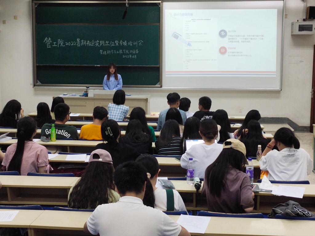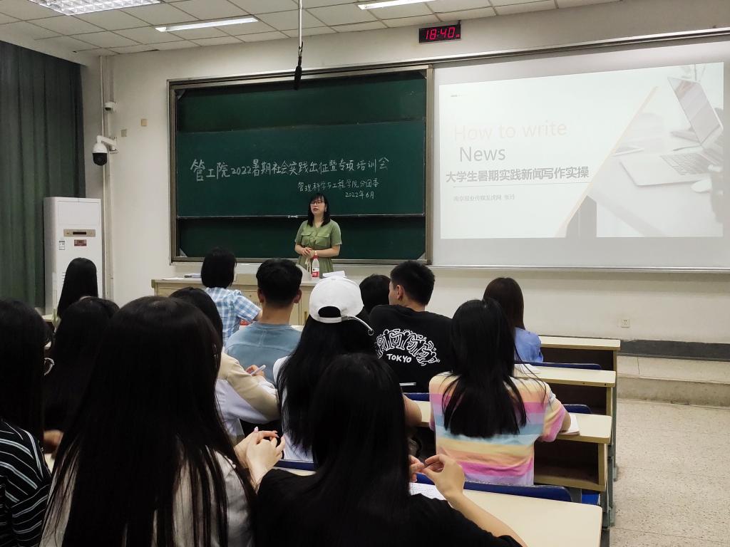 在专项培训会上,张玲老师以“新闻写作技巧”为题开讲,她从常规新闻撰写、好文章都有一个好选题、如何写出接地气的报道和如何不入坑等5个方面进行讲解,她的讲解生动有趣、逻辑清晰,同学们积极回答提问。张老师建议,暑期实践报道要具有社会价值和社会意义,同时能产生一定影响力,调研报告要运用权威结论且不能与当下政策相悖。王涵和赵英利两位同学结合自身实践分享了最真实的实践经历。