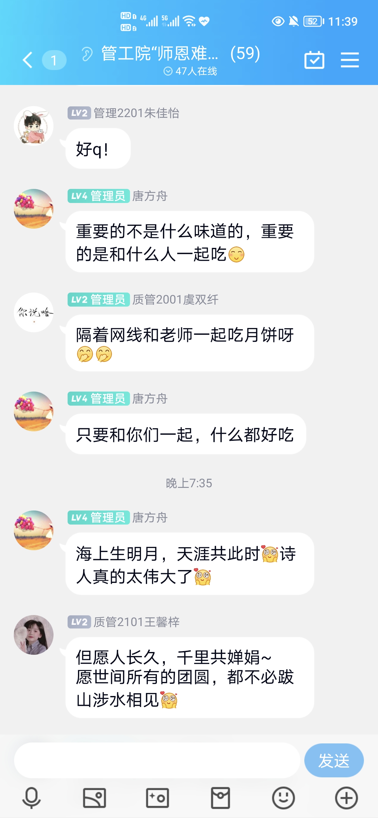 首先是线上诗词大会环节,“我寄愁心与明月,随风直到夜郎西”、“春江潮水连海平,海上明月共潮生”、“深林人不知,明月来相照”……同学们通过群聊玩起了飞花令,感受诗词之趣之美,气氛十分热烈。