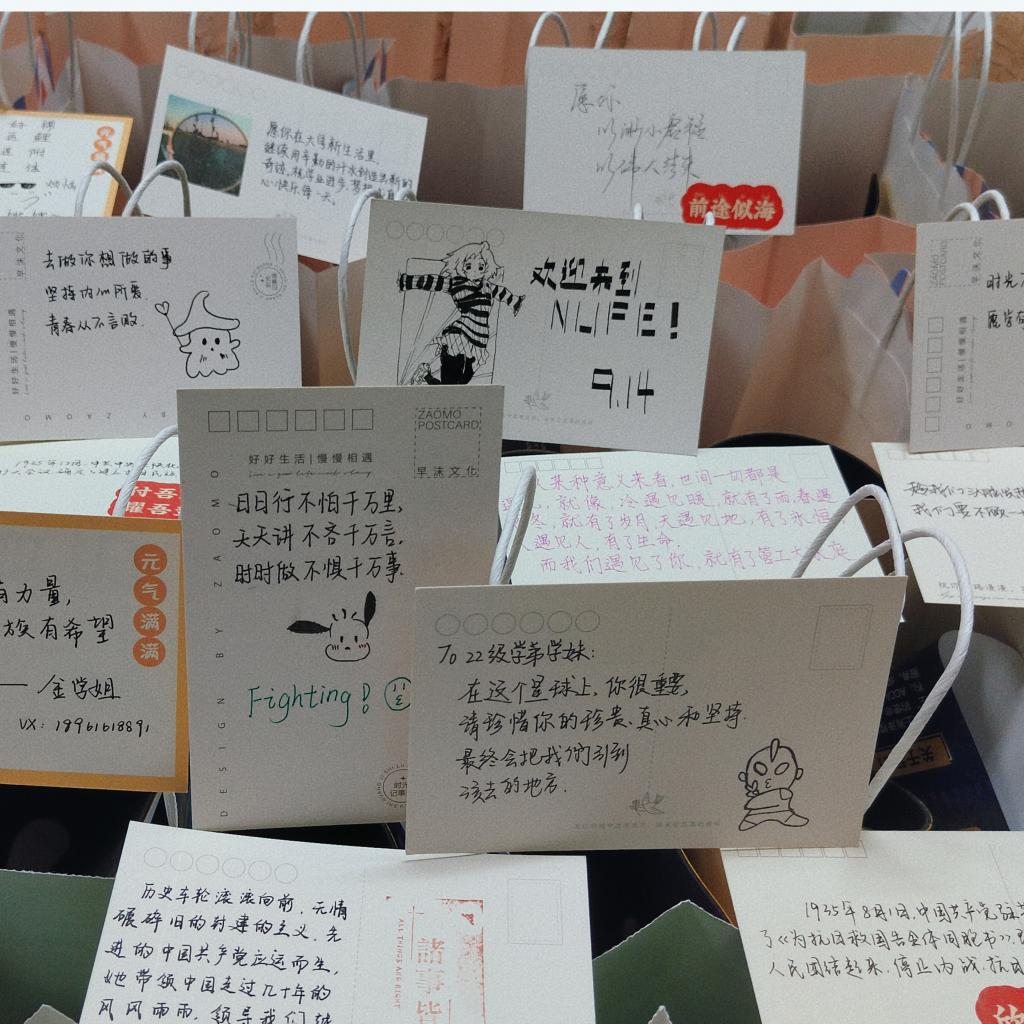 “亲爱的新同学,十年寒窗的你正站在历史交汇的“赶考”途中,需要真心、耐心、恒心。‘赶考’无终点,永远在路上。”“历史的接力棒传入我们新一代人手中,愿你在新的大学生活里,继续用辛勤的汗水创造出新的奇迹。”“在这个星球上,你很重要,请珍惜你的珍贵、真心和坚持,最终会把我们引到该去的地方”“坚持内心所爱,青春永不言败”......礼袋内含党史学习明信片140份,卡片上的内容由学院高年级同学亲笔绘制,寄语新同学美好期许,希望萌新们深刻感悟中国共产党矢志不渝为人民的初心宗旨,传承中国共产党进行伟大斗争铸就的革命精神,在大学找到属于自己的高光时刻。