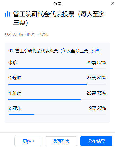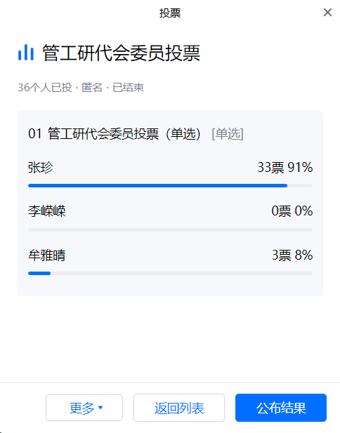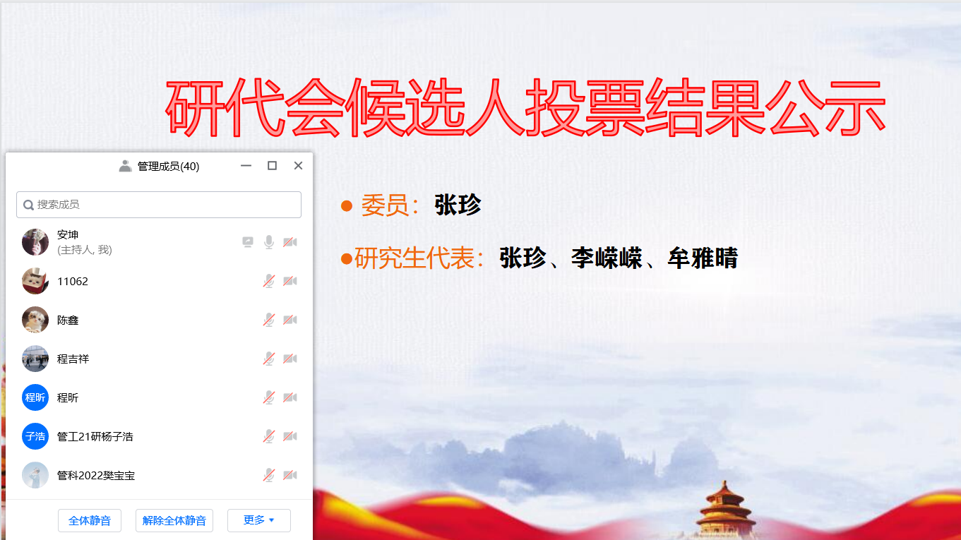 随后,进行第三届研究生会委员会候选人选举大会,由每位委员候选人分别发言,参会同学线上审阅《第三届研究生会委员会候选人名单》并针对名单酝酿产生过程是否合理发表意见。全体无异议表决通过后,安坤向全体参会成员发起线上选票,经无记名投票选举出一名委员候选人。最后经统计、核验,根据投票结果,推荐张珍同学为第三届研究生会委员会候选人。