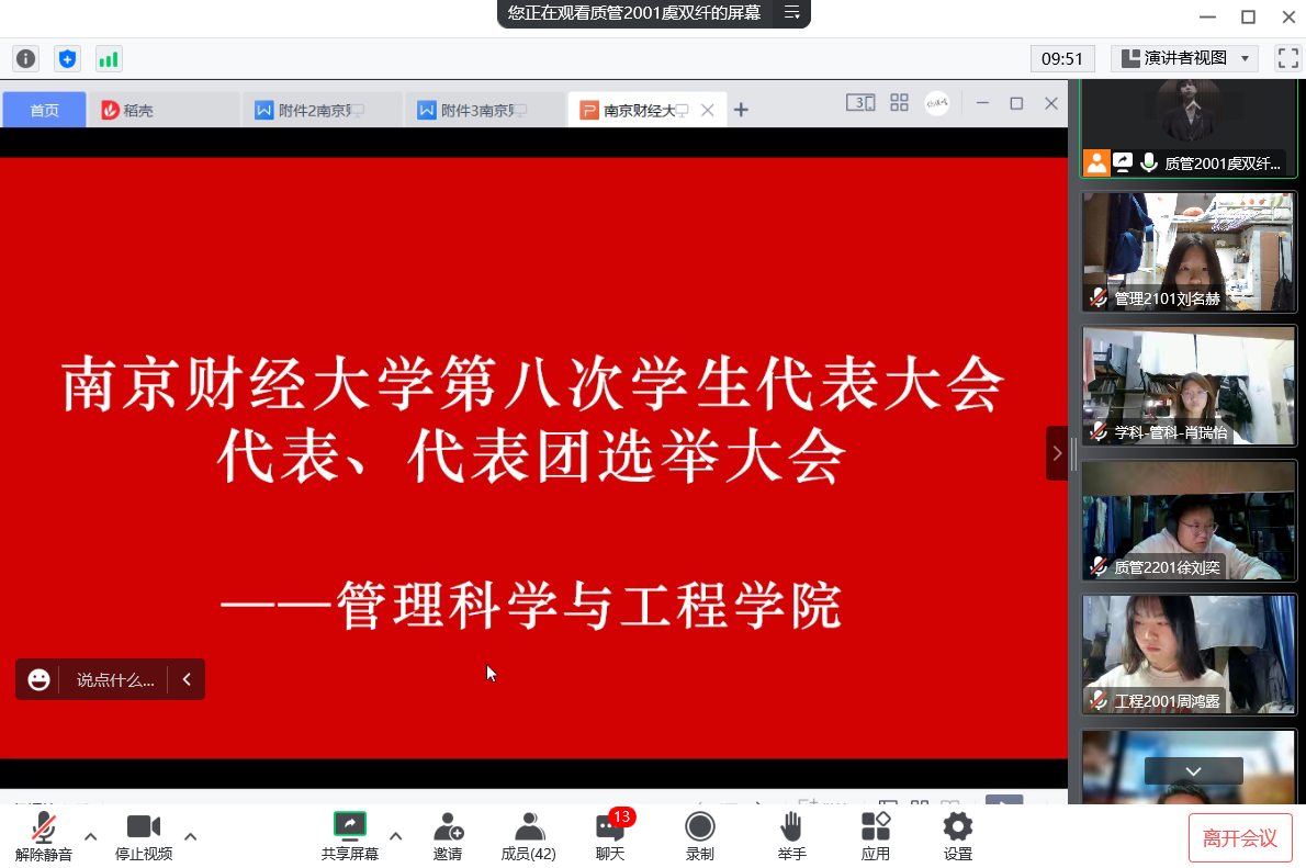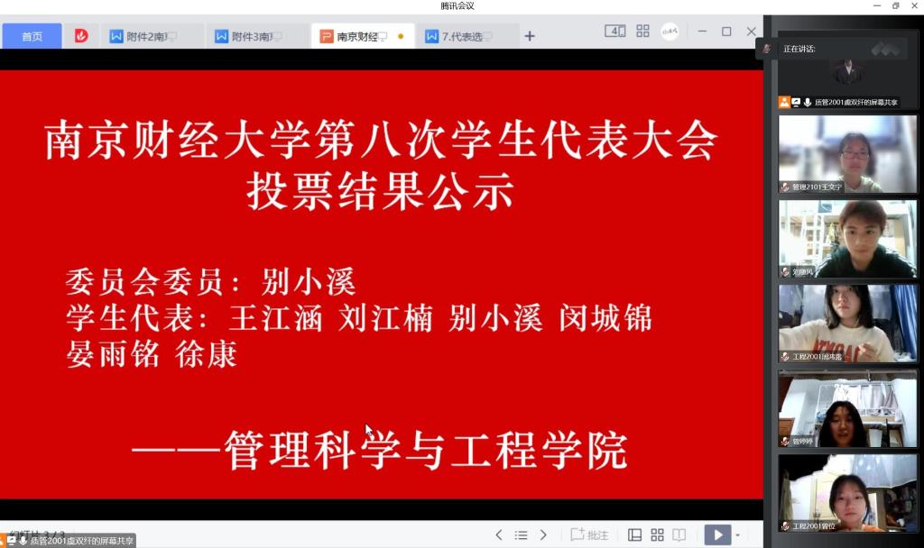 最终,质管2101别小溪、质管2101晏雨铭、工程2101刘江楠、管理2101徐康、管理2201闵城锦、质管2201王江涵当选第八届学生代表大会代表,质管2101别小溪当选第八届学生代表大会委员会委员候选人。