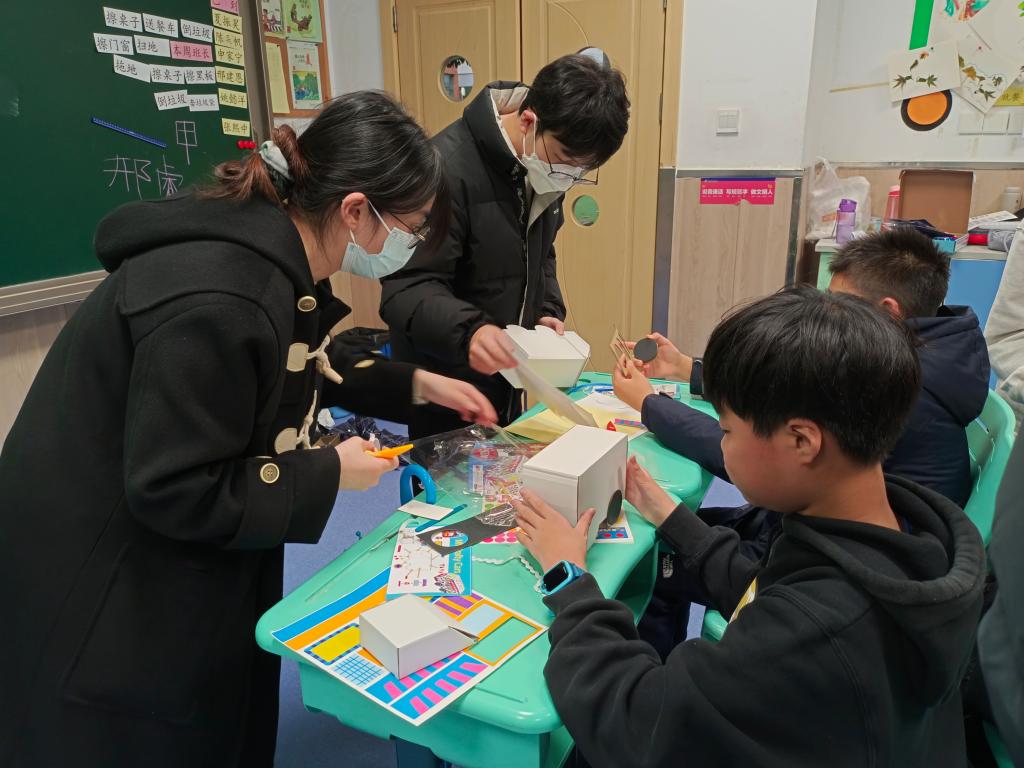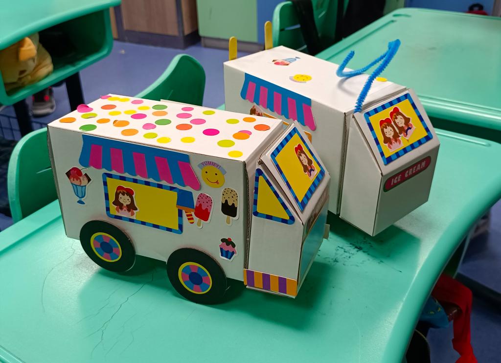 拼装完成后,小朋友们迫不及待地将自己的作品摆上桌面。原本平平无奇的纸板和彩纸经过志愿者和小朋友们的共同努力焕发光彩,变成了一辆辆精致的小卡车。小朋友们互相打量着各自的作品,忍不住赛起车来,惊呼不断。