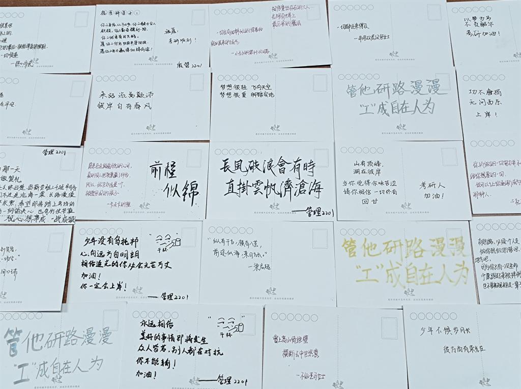 收到礼物的同学非常惊喜。工程1901的黄宇涛说“本以为自己是孤单的,但身边会有人在为你加油。有人在期待太阳,有人在期待月亮。我想,剩下的日子要坚持,因为我不想让自己后悔。”质管2201的顾淼表示,“感谢学院在这个寒冷的冬日为我们的心上燃起了一把篝火,让艰苦的备考时光变得温暖且精彩。”工程1901的李林汐说:“距离考研还有不到一个月的时间,大家都很焦虑,身心也都非常疲惫。但今天收到了学院的礼物,让我知道惊喜总会在不经意间出现,所以又有了坚持的动力。”