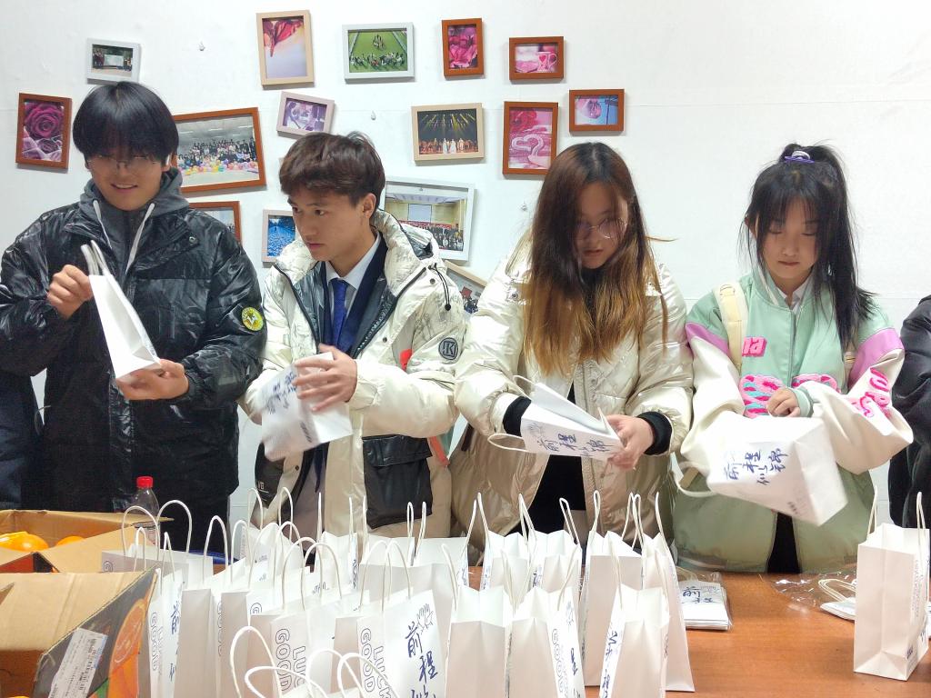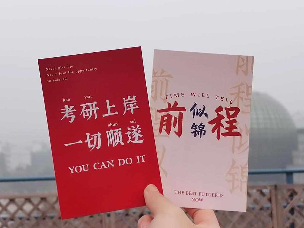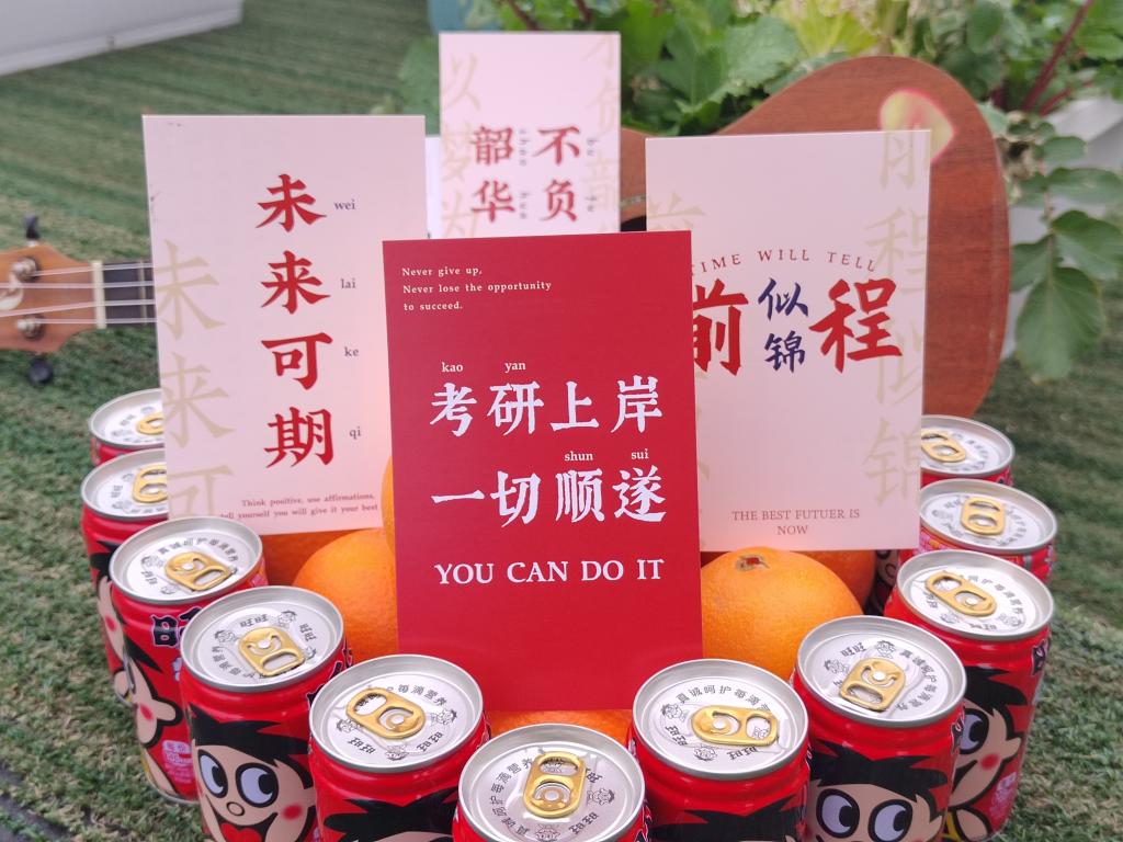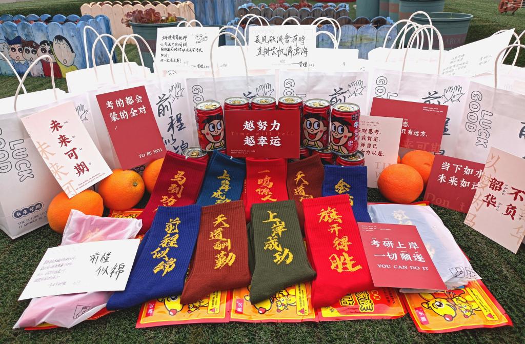 精心准备,细心装袋,满满的礼物,承载满满的祝福。脐橙寓意“旗开得胜,马到成功”,希望考研学子能够梦想成真,顺顺利利;橙子补充维C,解郁安神,希望考生以更加健康的体格迎接考试。牛奶和软糖希望能给考生送去满满的福气,让考生们学业旺运气旺。“一鸣惊人”、“顺利上岸”、“前程似锦”……一双双写满祝福的考研袜寓意着金榜题名、上岸成功,与其搭配的暖宝宝一起为考生带去冬日的温暖。“长风破浪会有时,直挂云帆济沧海”、“那些看似不起波澜的日复一日,会突然在某一天让人看到坚持的意义”、“以梦为马,不负韶华,考研加油”……由同学们亲手绘写装饰的明信片承载着对学长学姐们最真挚的祝愿,希望他们能一鸣惊人、顺利上岸。