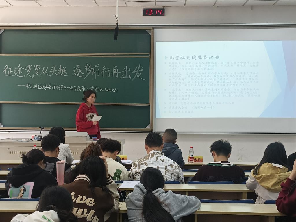 六个小组先后围绕“世界儿童日”主题进行展示汇报。各小组围绕儿童身心健康建设展开,活动策划形式多样、分工合理又充分展现了团队精神,评委老师认真倾听并评点打分。统分评奖期间,大家一起观看青马班视频,回顾学员们一起成长的点点滴滴。随后,学员代表晏雨铭同学上台发言,“青马班是为培养具有政治理论素养的优秀学生而设立的,通过辩论赛、经典阅读和电影鉴赏等各式活动,同学们的政治理论素养和学习工作能力都得到了提升,班级氛围和同学感情也得到了加强。”