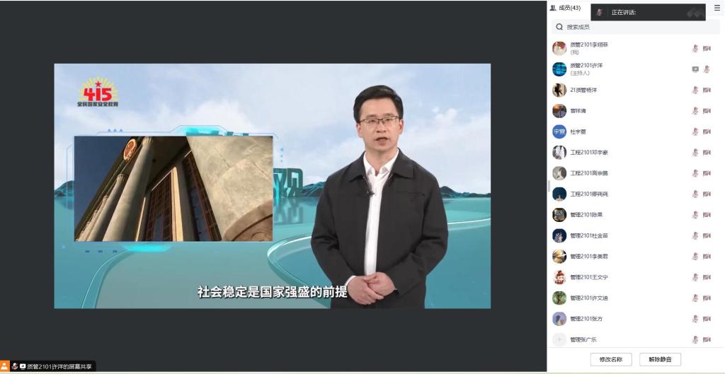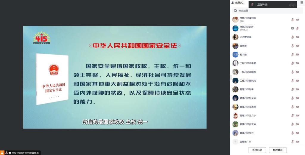 4月14日,williamhill英国通过腾讯会议举办了全民国家安全教育日重点宣传教育活动。本次活动由质管2101许洋主持,管工院2021级全体学生悉数参加。