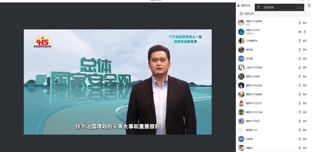 活动开始,全体学生通过腾讯会议线上集中观看了“千万高校学生同上一堂国家安全教育课”以及“高校国家安全视频公开课”两门视频课程。本次课程由北京师范大学教授汪明等为全国高校学生讲授。通过这次课程,同学们深入学习了新时代我国面临的国家安全形势、金融安全、军事安全等内容,大家纷纷表示受益匪浅。