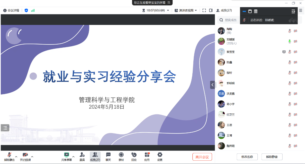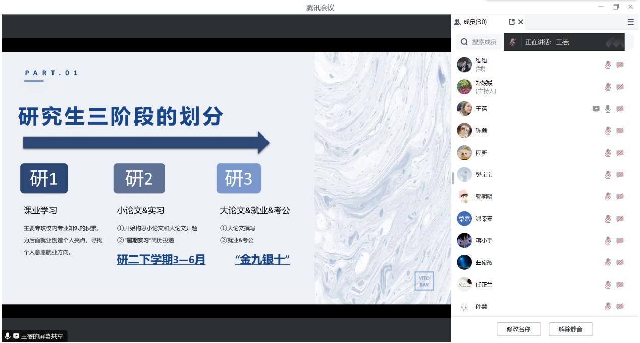 为帮助我院研究生更好规划就业目标和未来发展,2024年5月18日晚,williamhill英国研究生班级通过腾讯会议,举办就业与实习经验交流会,邀请管工21级研究生王蓓、工程管理23级研究生蒋小宇进行了经验分享并代表公司进行招聘。管工2022级、2023级研究生悉数参加,研究生辅导员郑媛媛老师主持会议。