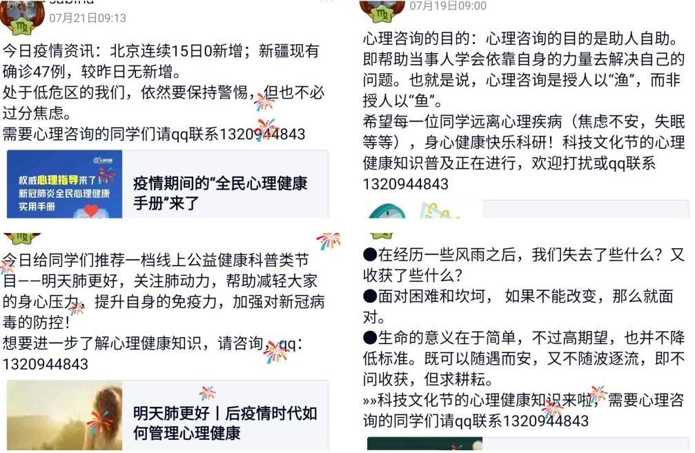 另外,在活动期间研究生院为同学们印刷疏导心理问题相关的图片和阅读材料,并邮寄给每位同学。以上是疫情未开学时期科技文化节心理健康的宣传活动和线上解答大家的困惑。在活动期间,我们邀请心理辅导老师通过群电话或群视频定期开展线上访谈活动,针对大众关心的问题,通过有问有答的形式深入浅出的讲解大学生的心理特点、如何保持心情平和等。