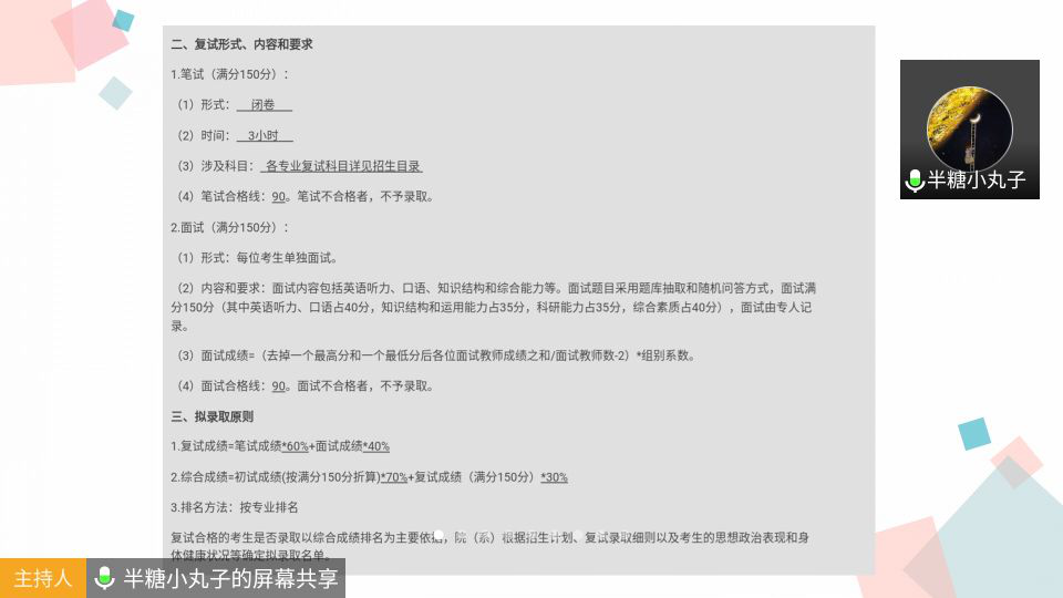 疫情期间,为进一步帮助2021届考研学子有计划、有针对性地备战考研,管理科学与工程本科生党支部邀请优秀学生党员唐静于2020年5月8日下午基于腾讯会议平台,举办了面向2017级同学的考研线上交流会。学生支部书记郑老师、2017级部分考研意向学生参加会议。