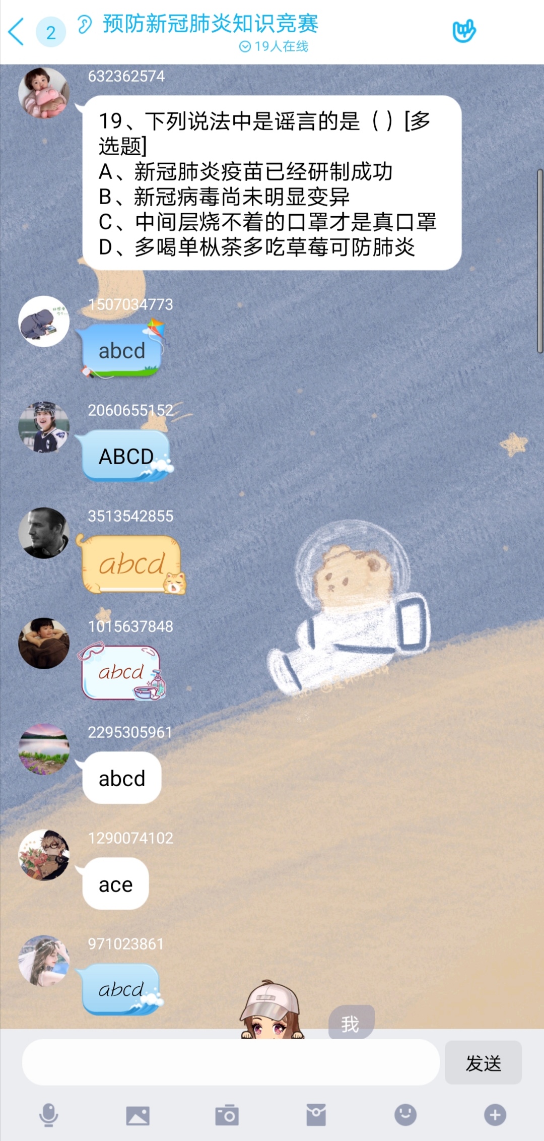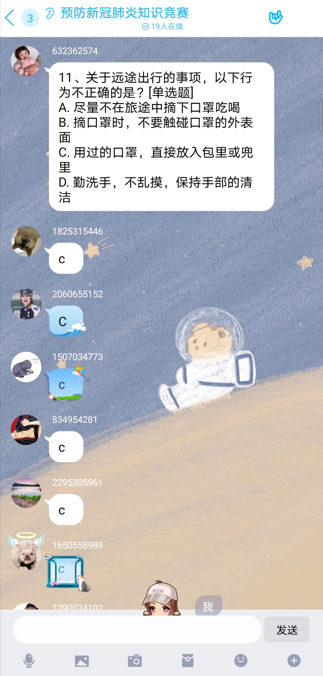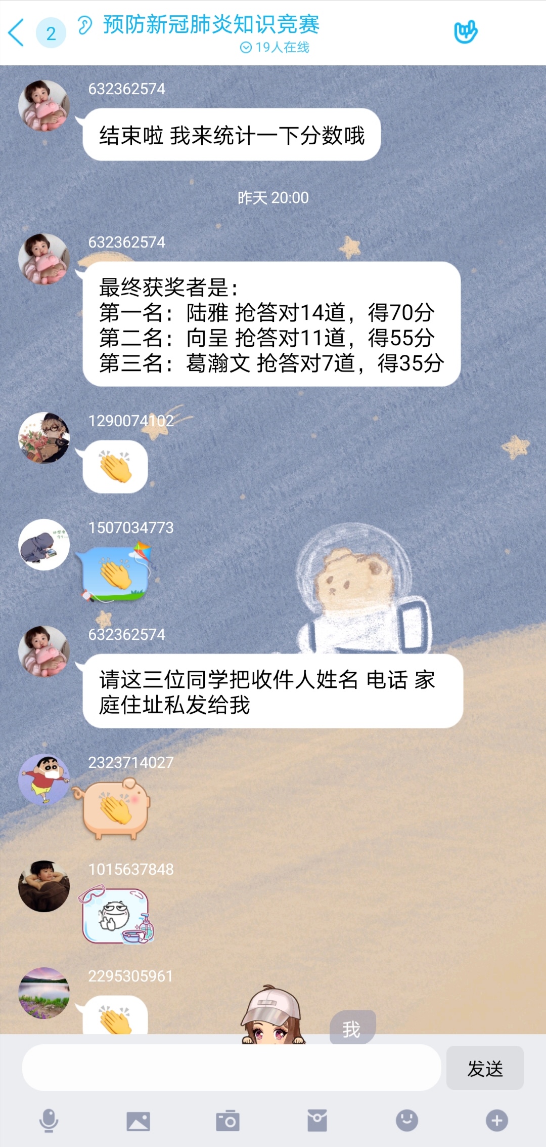 因疫情原因,活动在线上开展,管工院同学积极参与。3月4日晚,知识竞赛正式开始,院学生会外联部部长张佳仪作为主持人在QQ群内发布竞赛题目,参赛同学火热抢答。题目紧密结合新冠肺炎相关知识,例如远途出行应该注意哪些行为?如何做好自我防护?如果成为密切接触者应该避免什么?比赛过程精彩激烈,大家你追我赶,最终在“公开,公正,公平”的原则下,竞赛负责人统计出得分排名前三的优胜者在群内公告,并将快递精美礼品送达。