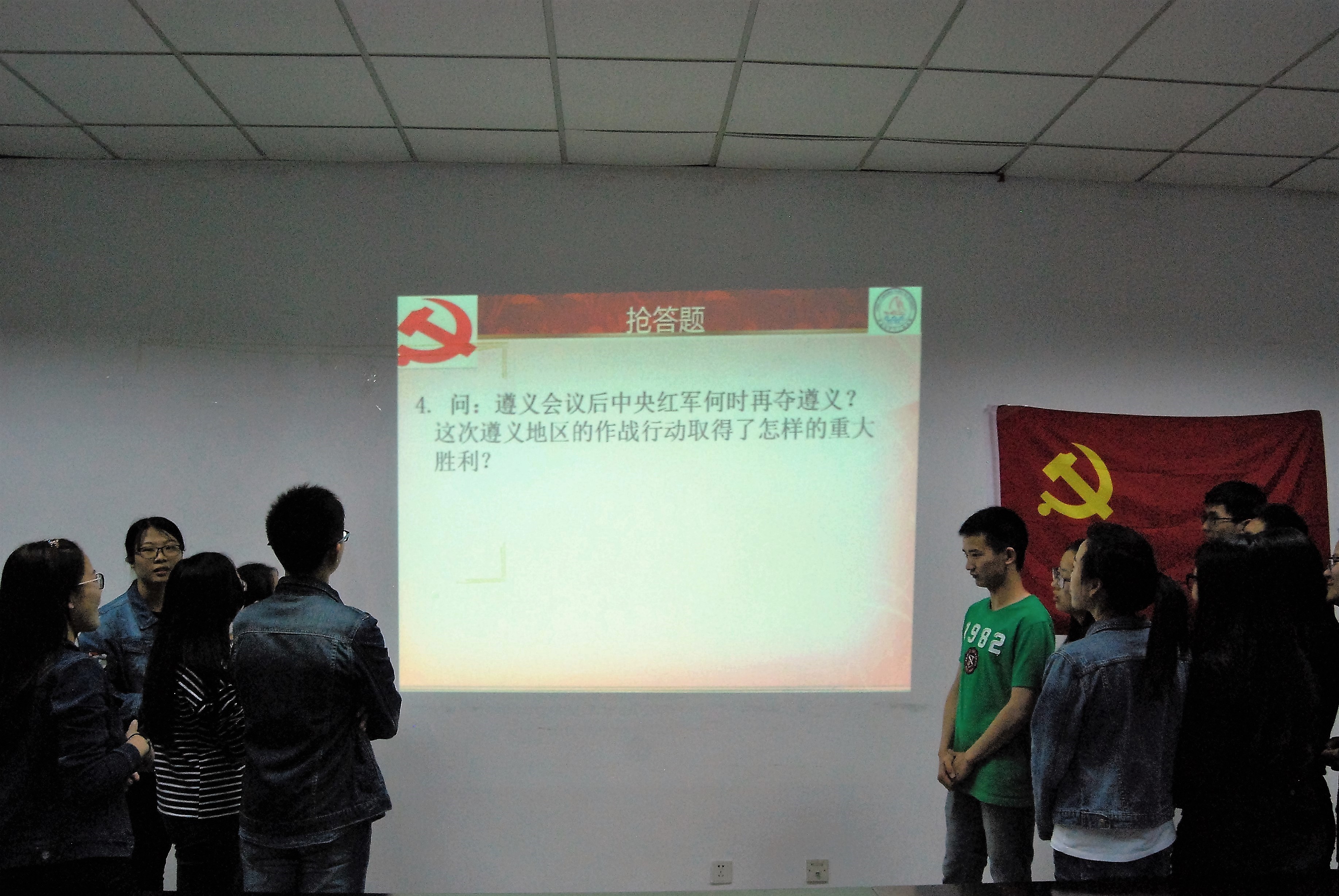 5月23日晚,在经济学院会议室里,由williamhill英国学生党支部与经济学院经济系、统计系学生党支部联合举办的“学党章,忆长征”纪念长征胜利80周年知识竞赛紧张进行中。来自两个学院的16名党员和入党积极分子组建的4支队伍竞相抢答,现场气氛热烈。