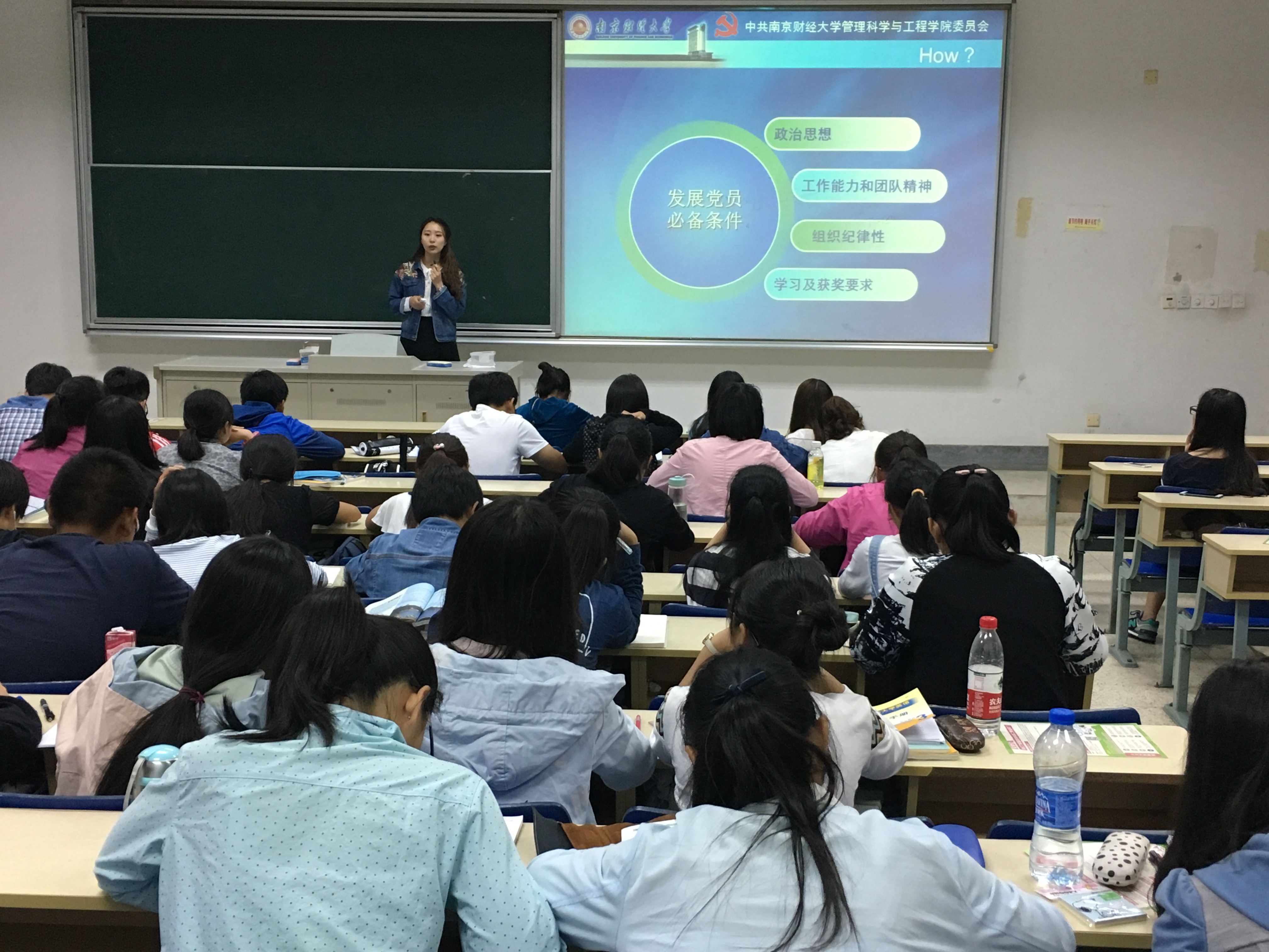 活动中,主讲人首先介绍了管工院党总支的组织结构,具体介绍了党的性质、宗旨、发展历程、党员发展概况和正确的入党动机。要求有入党意愿的同学应尽快适应大学学习和生活,在学习和实践中提高自己的思想政治素养,不断纠正和净化自己的入党动机,树立坚定的政治信仰,不断追求进步,从多方面提升自我。接下来主讲人介绍了发展党员的工作流程并以生动的案例为大家讲解党申请书、个人自传和思想汇报的书写。随后,在场的学生党员会同主讲人共同回答新生提问并鼓励大家心存理想,志存高远,争取早日成为一名中国共产党党员。