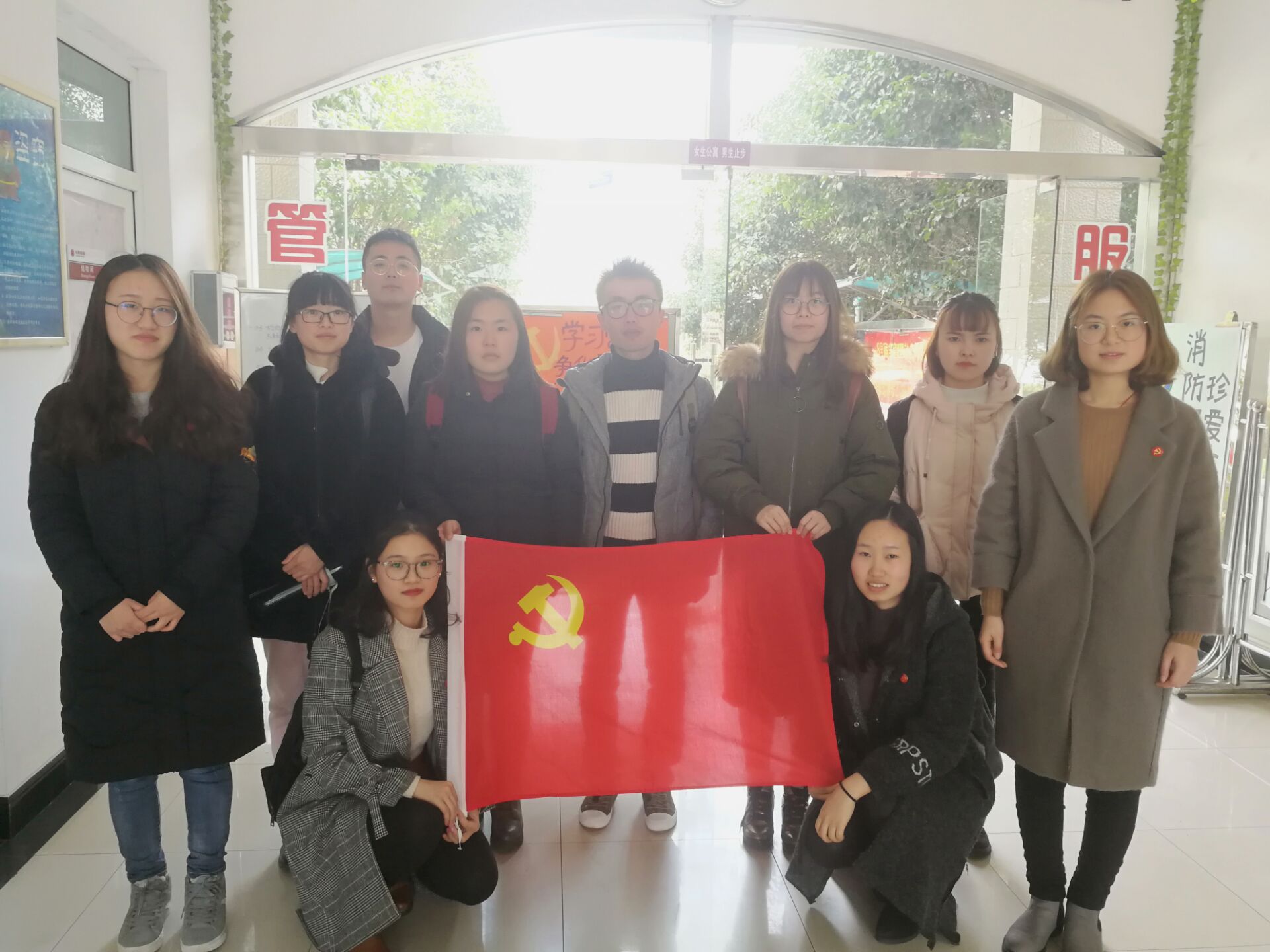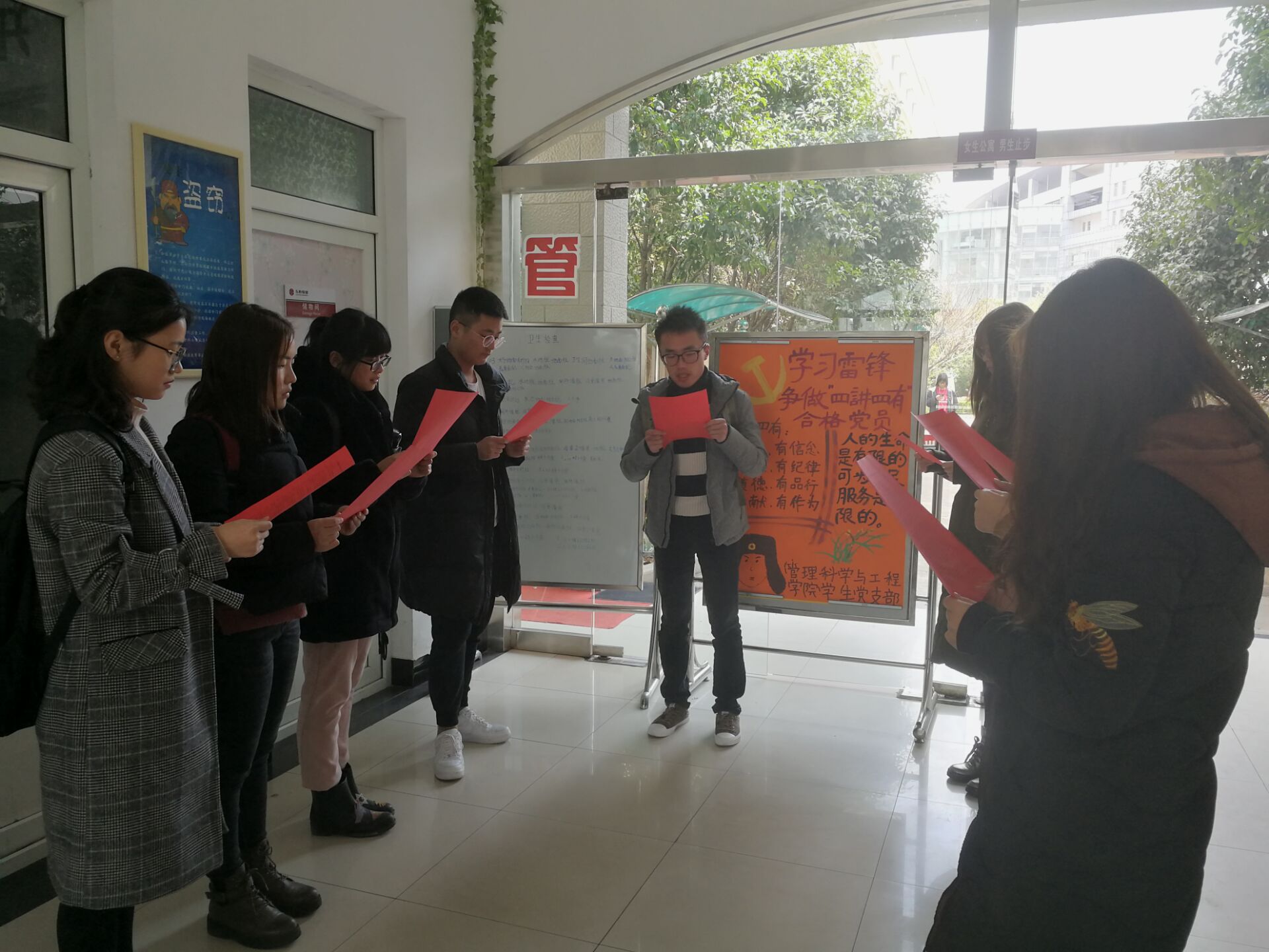 首先由赵航行同学宣读了活动倡议书,倡议书表达了对雷锋同志的怀念,重温了雷锋精神,强调了学习雷锋同志,弘扬雷锋精神,已成为时代发展的必然要求,并且对各位党员提出了向雷锋同志学习,做一名讲政治、有信念,讲规矩、有纪律,讲道德、有品行,讲奉献、有作为的合格党员的要求。接下来,在宿管站站长的分工下,各位同学纷纷满怀热情进行义务大扫除,清爽明亮的门窗,整齐干净的楼道,精彩纷呈的宣传栏,同学们不怕苦不怕累的精神赢得了宿管站员工的称赞,营造了整洁舒适的生活环境。活动最后,全体成员与党旗合影留念。
