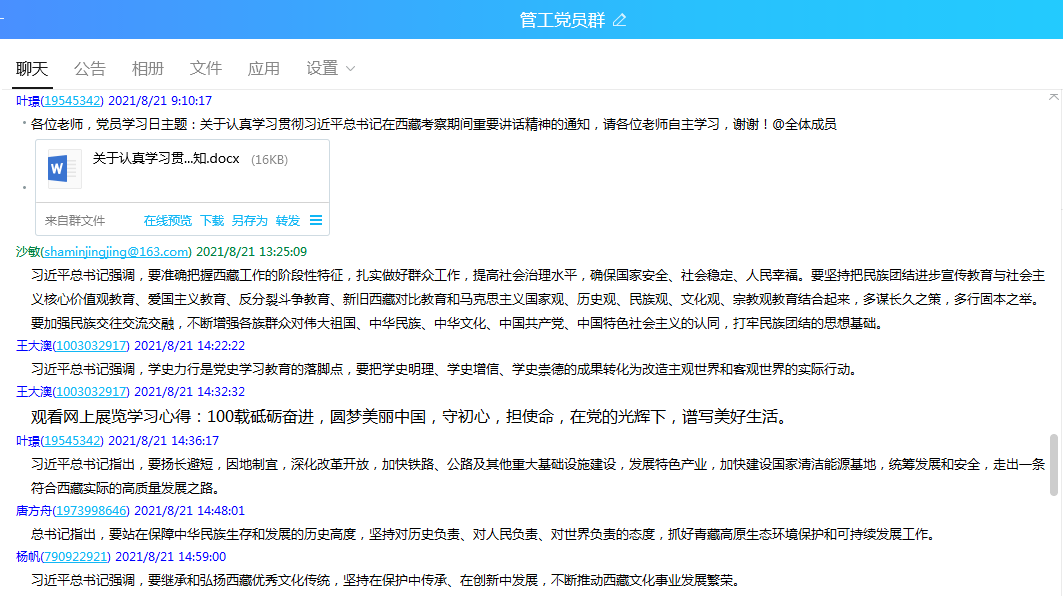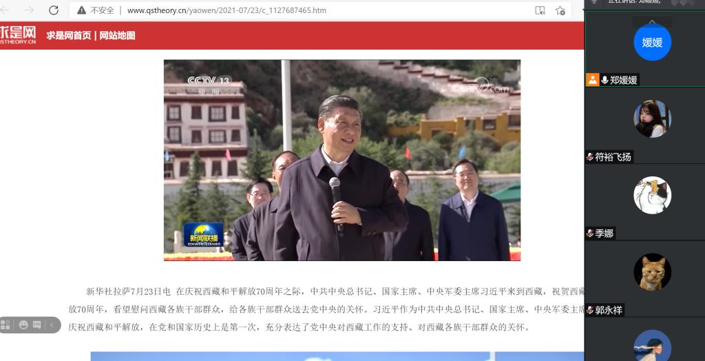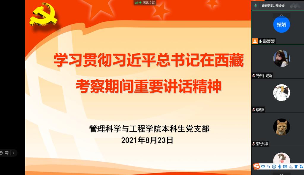 8月21日上午9点,管工院教工党支部在腾讯会议认真学习贯彻习近平总书记在西藏考察期间重要讲话精神,会议由支部副书记沙敏主持,会后党员们积极在党支部QQ群中发表学习感想。8月23日,研究生党支部通过腾讯会议,在线学习了习近平总书记在西藏考察期间重要讲话精神,支部书记吴筱月主持会议。8月23日晚,本科生党支部利用腾讯会议,组织学生党员集中学习了习近平总书记在西藏考察期间重要讲话精神,集中观看“新华视频:习近平总书记来到西藏,祝贺西藏和平解放70周年,看望慰问西藏各族干部群众”;学习“求是网”文章《习近平在西藏考察时强调全面贯彻新时代党的治藏方略,谱写雪域高原长治久安和高质量发展新篇章》和“共产党员网”文章《我们的传家宝│老西藏精神》。支部书记郑媛媛老师主持会议,学生党员们积极交流学习体会。