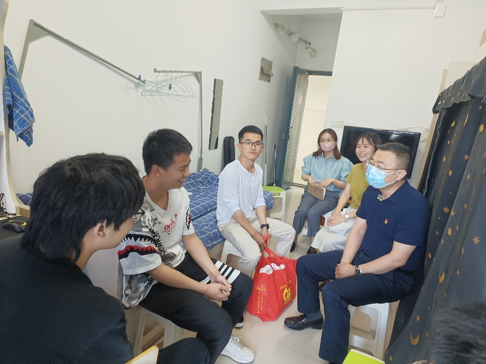 在学生宿舍,赵国栋部长与学生们进行亲切交谈,仔细询问了解同学们的学习和生活情况,认真听取同学们对于科研、运动、饮食、疫情防控和校园管理等方面需求和建议,并与学生们分享自身学习工作经历,鼓励大家要充分发挥党员的先锋模范作用,争做表率。赵国栋部长就学生们提出的问题一一作出详细解答,并表示会及时解决大家的问题,力求为学生们创建更优美舒适的校园环境。此外,在酷暑来临之际,赵国栋部长给学生们带来夏季防暑用品,叮嘱大家做好个人防护,注意饮食卫生安全,积极参加体育锻炼,提高自身素质,注重身心健康。