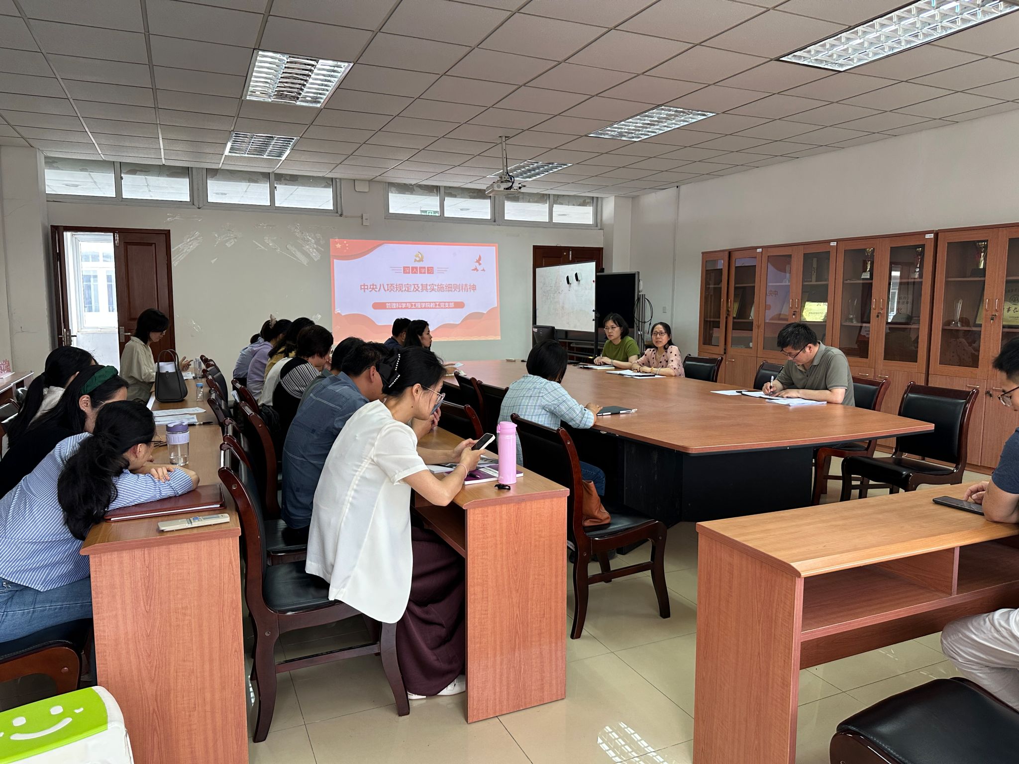为持续推进深入贯彻中央八项规定精神学习教育走深走实,进一步加强教工党员的党性修养和纪律意识,营造风清气正的育人环境,2025年5月21日,管工院教工党支部组织开展中央八项规定及其实施细则精神专题学习会,会议由支部书记杨帆主持,教工支部全体党员参会。