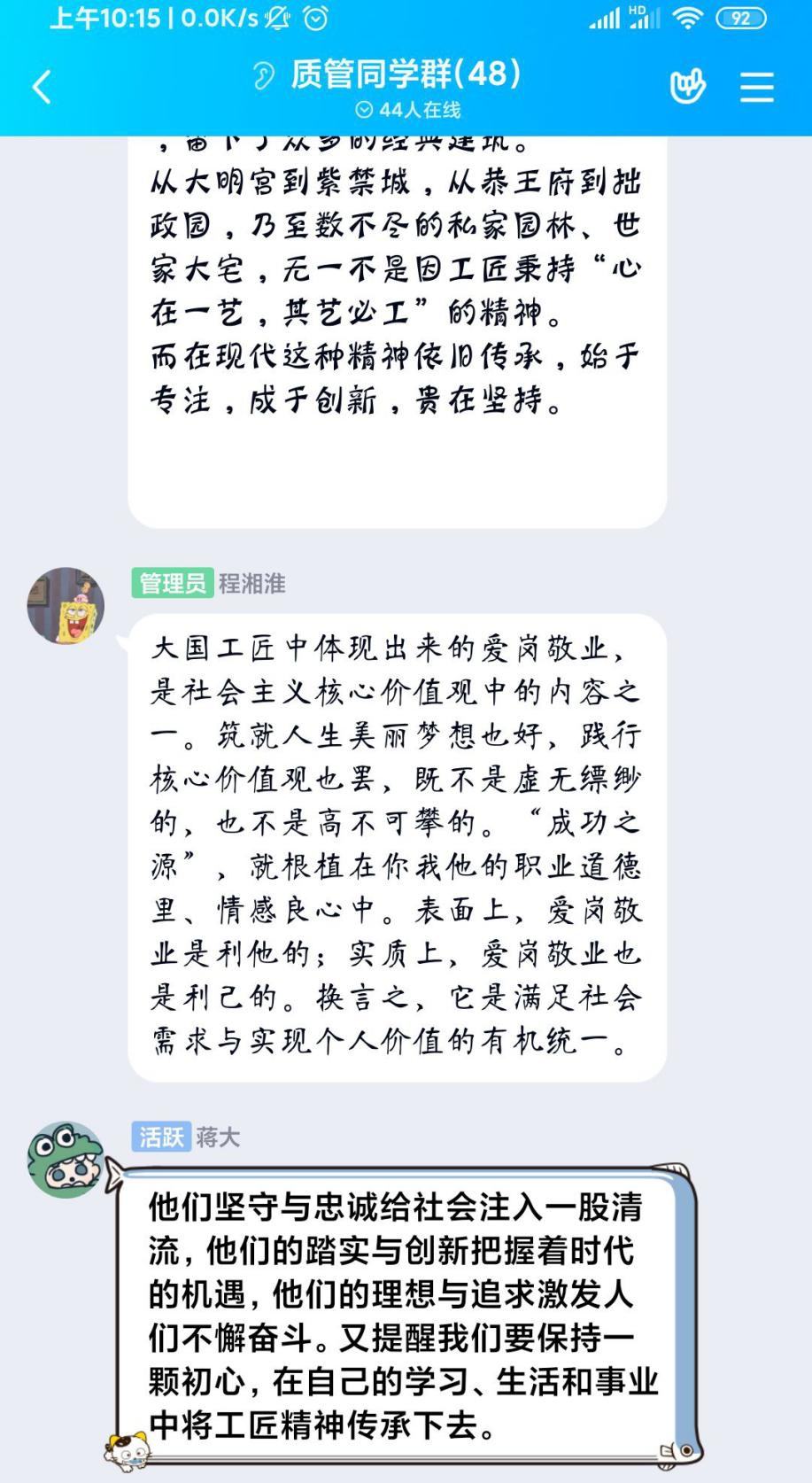 为了深化对工匠精神和劳模精神的理解,以榜样的人格魅力感染和教育学生,2020年4月30日,在五一劳动节来临之际,质管1701班积极响应学校五一劳动节“五个一”活动,质管1701班举办“观《大国工匠》,学工匠精神”“影像志”活动,全班同学在线一起观看了《大国工匠》纪录片,并交流观影感想。