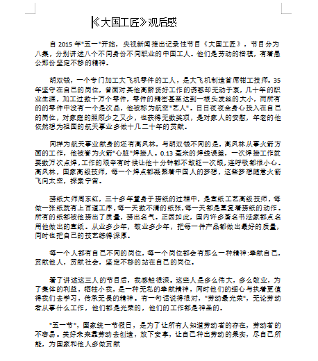 观影结束,同学们都发表了自己的感想,有的同学还写了观后感。班长赵玉田说,作为质量人,应努力追求卓越,学习和发扬工匠精神,爱岗敬业,执着专注,精益求精,不断创新。通过这次主题班会,同学们认识到劳动光荣,创造伟大,无论从事什么职业,都要认真勤奋,刻苦钻研,努力在平凡岗位上创造不平凡的成就,为实现伟大的中国梦奉献力量。