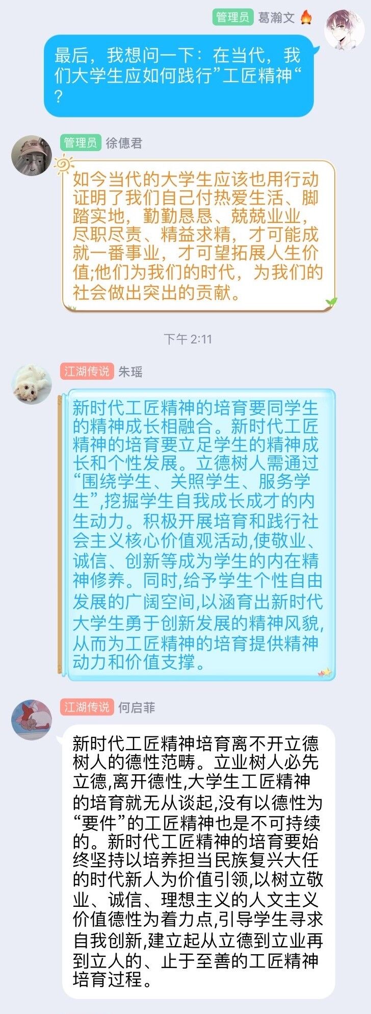 讨论会的最后,团支书葛瀚文表示,“工匠精神”是一种精神,一种品质,一种态度;在以后的工作中,会将“工匠精神”贯彻其中,加强团支部建设。