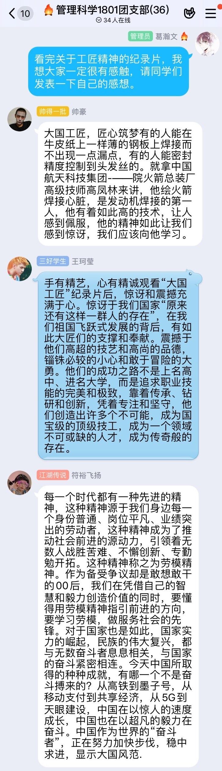 观影结束后,团支部进行线上感想讨论会。支部成员被影片深深感染,在发表观影感想时积极活跃。班长帅豪说:“大国工匠,匠心筑梦有的人能在牛皮纸上一样薄的钢板上焊接而不出现一点漏点,有的人能密封精度控制到头发丝的。就拿中国航天科技集团-——院火箭总装厂高级技师高凤林来讲,他绘火箭焊接心脏,是发动机焊接的第一人,他有着如此高的技术,让人感到佩服,他的精神如此让我们感到惊讶,我们应该向他学习。”