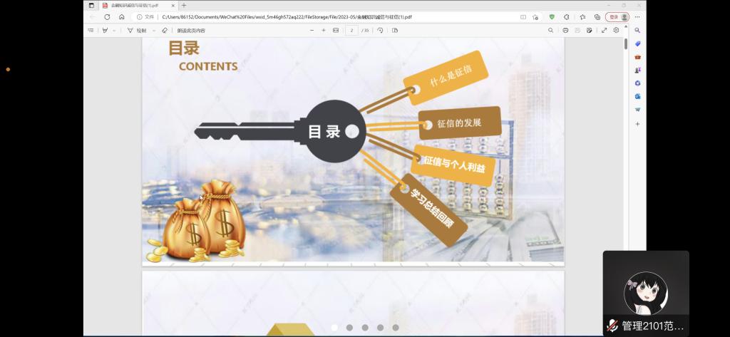 为了增强同学们的诚信意识、风险意识和感恩意识,5月26日,管理2101班成功举办了“诚信与征信”资助诚信教育主题线上班会,班级所有同学全部参加。会议由安全纪律委员李启杰同学主持。