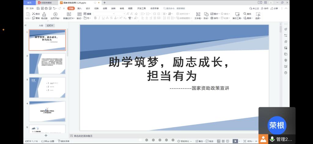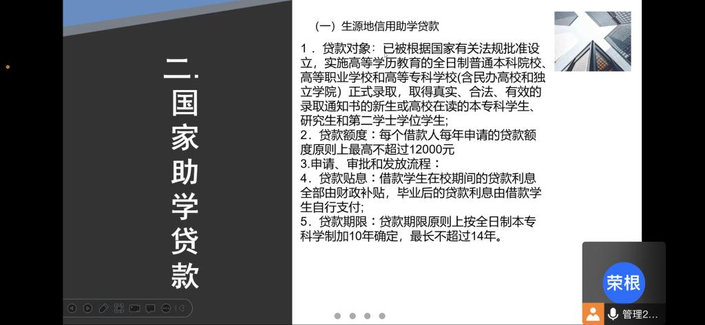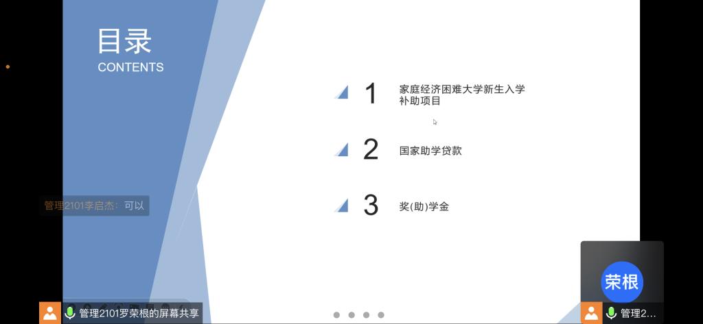 之后罗荣根同学进行“助学筑梦,励志成长,担当有为”国家资助政策宣讲,刚开始他介绍了家庭经济困难大学新生入学的补助项目以及补助对象、补助标准和申请、审批、发放流程,随后他从贷款对象、贷款额度、申请、审批、发放流程和贷款期限这些方面详细讲解了国家助学贷款。最后他介绍了各类奖学金和助学金。