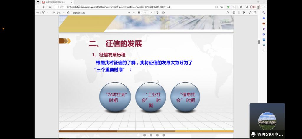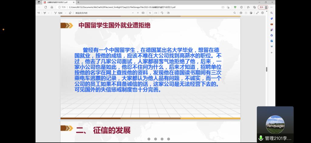 然后李启杰同学介绍了我国征信发展的三个重要时期,又延伸到国外征信发展历程和失信惩戒制度。接下来是最为重要的一部分,也就是征信与个人利益,李启杰同学从实际案例入手,告诫同学们要做一个诚实守信的人,才能使人生之路越走越宽广。