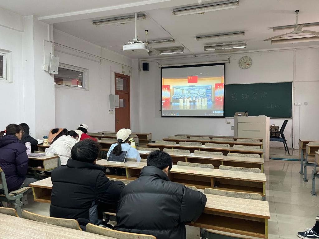 之后,教育部领导领读宪法部分条款,观看直播的同学同步跟读。“中华人民共和国的一切权力属于人民......”同学们专心致志,领读结束后,由学生合唱团领唱歌曲《宪法伴我们成长》,同学们一起跟唱,“红旗长扬,我们迎着朝阳,成长路上,聆听宪法雄壮的声响......”一曲结束,活动氛围达到高潮。