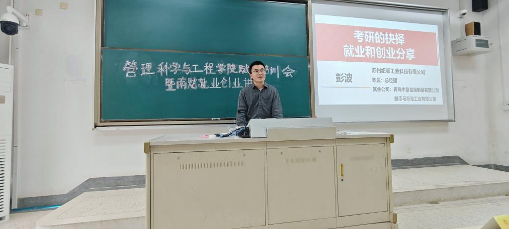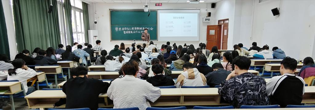 而后是优秀校友彭波学长发言。他结合自身就业、创业的经历教导我们要学会打破常规的思维,学会整合资源。随后他向我们分析了考研与就业的利弊以及就业的技巧。他提到考研不是唯一的出路,人生有多种可能。