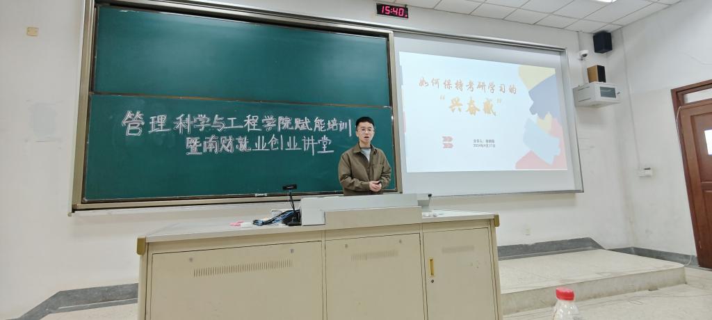 随后是质管2101班的晏雨铭同学发言,他分享的主题是“如何保持考研学习的‘兴奋感’”。他说“考研是一场全方位的比拼,拼信息,拼效率,拼时长。我们要早睡早起,规律作息。而备考的旅程注定是痛苦的、孤独的,要学会习惯孤独,享受寂寞。”而后,他以在校团委的学生工作经历告诫我们要常感恐慌,不甘落后。