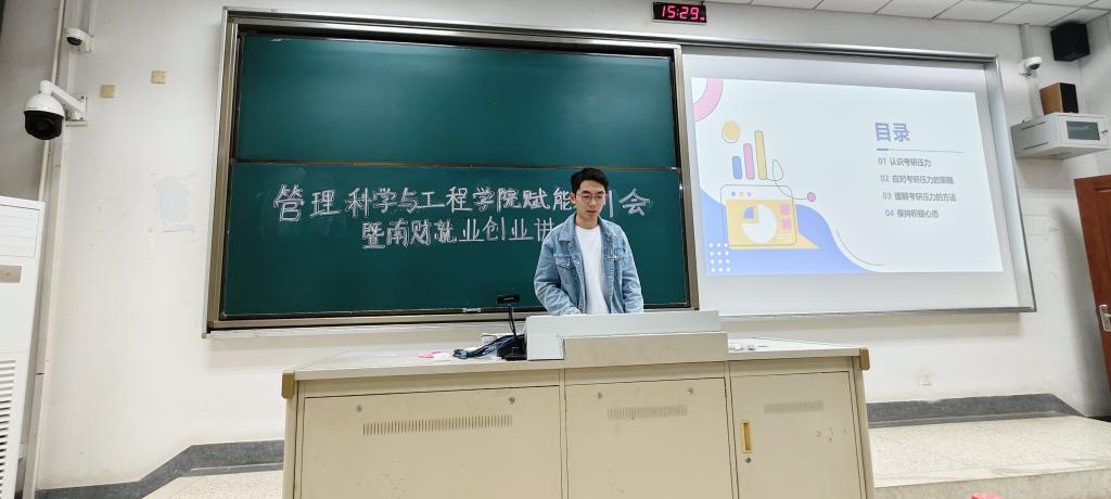 接下来工程2101班陈仕树同学以“正确面对考研压力”为主题展开分享,他分析了考研压力的来源以及其对于我们的危害,并建议我们通过调整心态、合理规划时间和建立有效的支持网络来应对考研压力。他还通过自身经历提醒我们运动解压时要量力而行以免受伤。