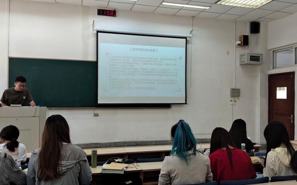 首先,王浩然向同学们介绍什么是诚信资助政策:诚信资助是国家以及高校对贫困学生给予的资助,是帮助家庭困难学生完成学业的重要途径。随后他讲解了国家助学金的申请条件和评定工作原则、助学生源贷款的申请条件和违约后果等内容。想要申请国家资助的同学可以根据自身情况按规定的程序申请。王浩然还提醒到申请国家助学贷款的同学要严格履行合同,按时还款,避免因一时疏忽留下信用污点,从自身做起增强诚信意识和法律意识。最后,王浩然通过违约案例、诚信宣传视频的方式强调诚信的重要性:诚信是大学生树立理想信念的基础。大学生只有养成诚信实用的道德品质,才能真正忠诚于国家和民族的事业。