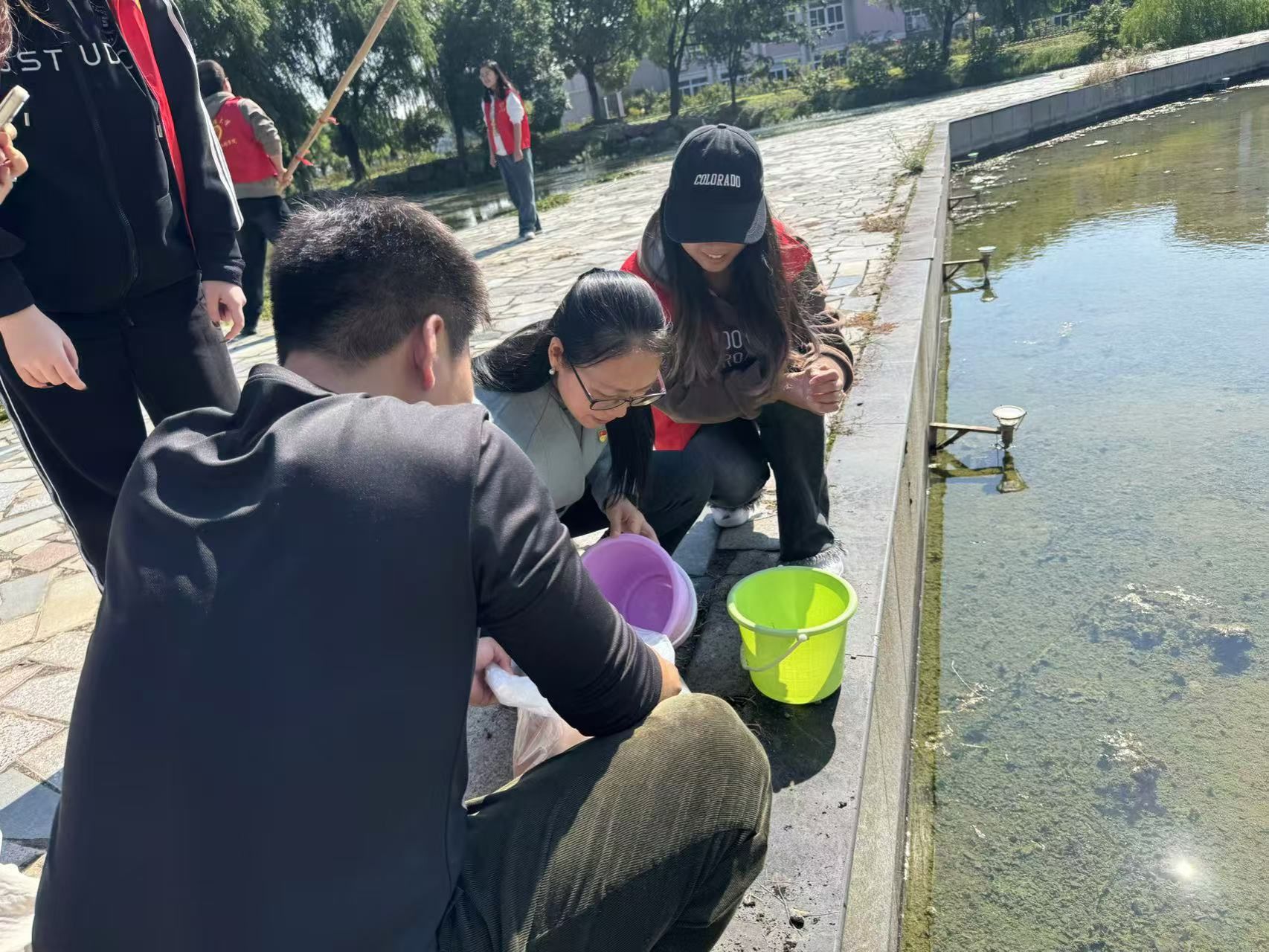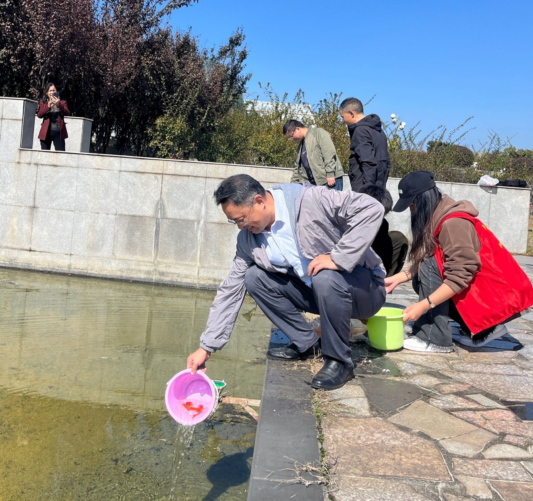 劳动结束后,师生们共同进行了锦鲤放生活动。大家小心翼翼地将一尾尾鲜活的锦鲤放入清澈的水中。鱼儿在水中欢快地游弋,仿佛也感受到了这份来自师生们的深情厚谊。院长刘军老师介绍,鲤鱼跃龙门是中华民族传统文化中象征着成功与希望的经典意象,它代表着学校对同学们的深切祝福和殷切期望。