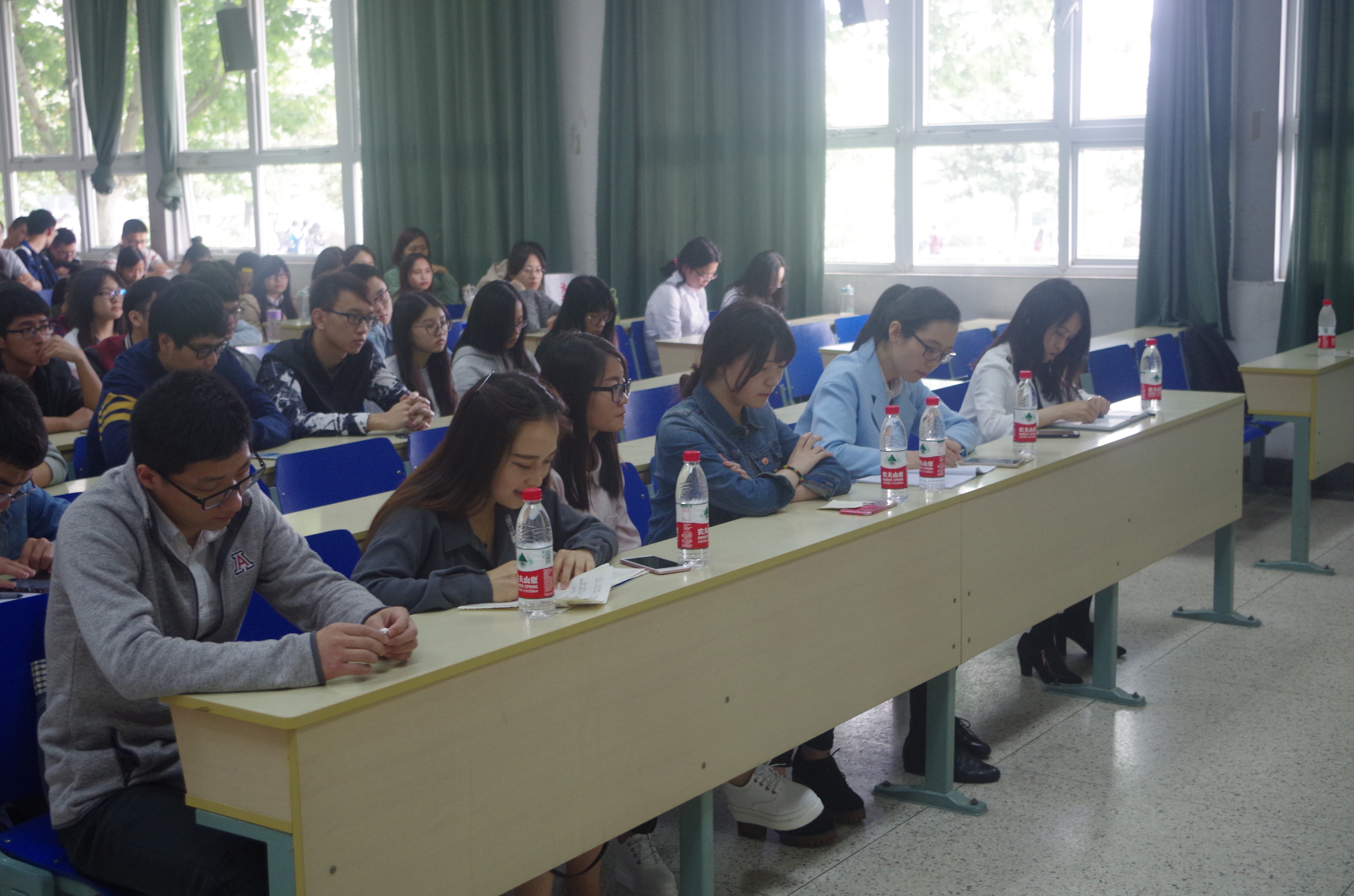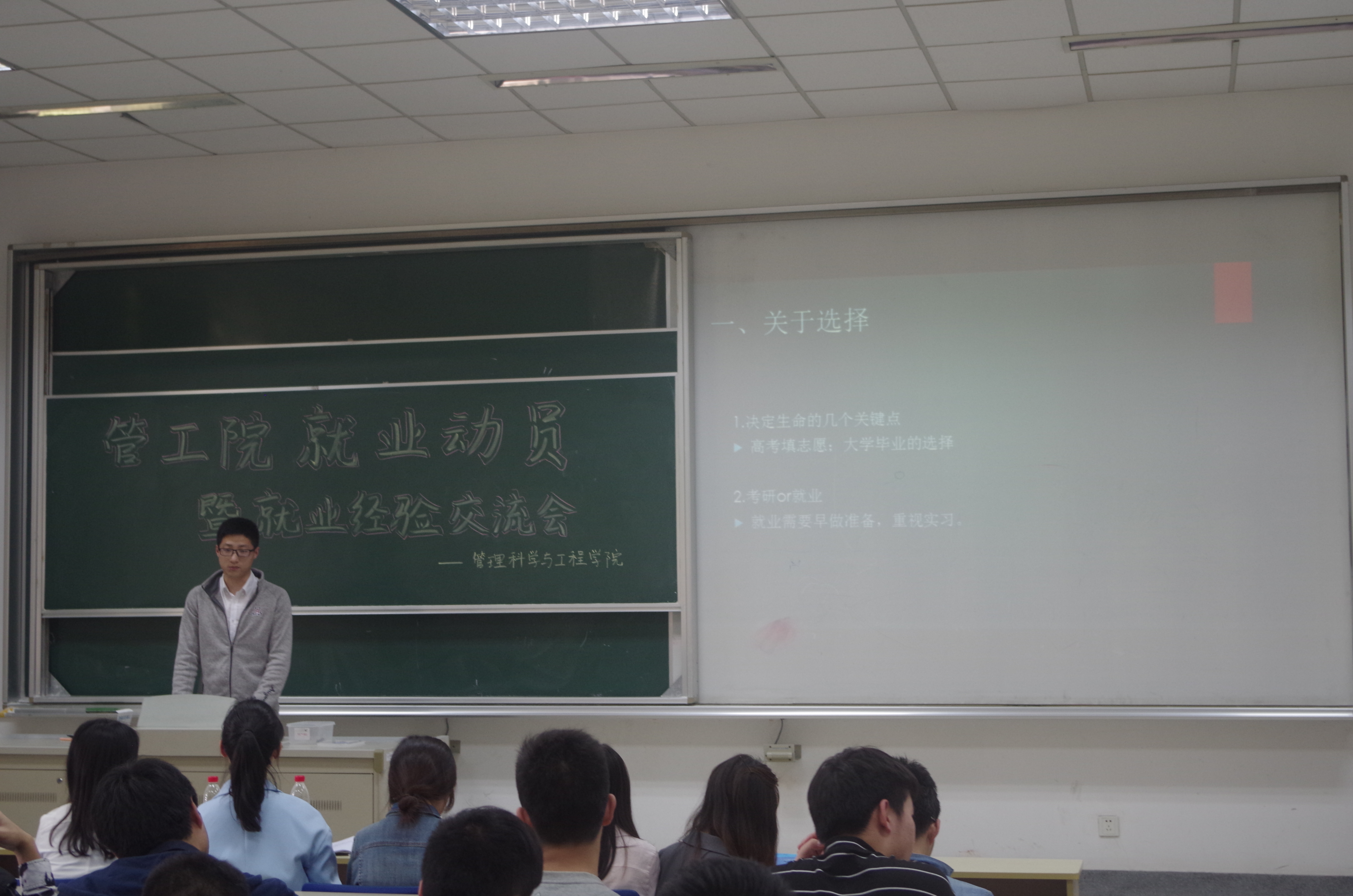 接着,已被友达光电录用的张淑娟同学针对自我介绍、职业发展、求职的准备,细致具体地分析了自己应聘品质工程师的经历,并指出选择了一个职位意味了选择了一种生活方式,一定要慎重考虑;已被上海浦发银行录用的荣妍妍同学,就银行网申、笔试、面试的准备和技巧作了详细介绍,并认为自我介绍要与众不同有亮点才能脱颖而出;已被苏州吴中招商局录用的薛珺同学传授了面试技巧和自身独特的求职经历,认为面试一定要自信镇定,表达自己对职位的强烈渴望;已被南京银行录用的李玉杰同学提出,人生就是不断地选择,求职是尤为关键的一次选择,他分享了因为自己对哲学的爱好而被录用的经历,认为平时应该多看书多积累,面试的时候才能厚积薄发。四位分享者还与现场同学进行了互动交流。