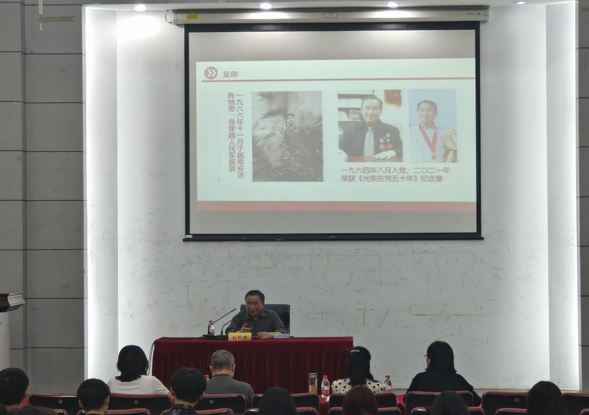 刘树铭老师以“听党指挥,强军保国防”为主题,为师生讲述了当年可歌可泣的战斗故事和光荣历史,鼓励青年学子响应党的号召、不负时代使命。“光荣在党50年”纪念章、用击落敌机残骸制作的战斗机模型、政府颁发的“战斗友谊纪念章”......一幅幅老照片带领同学们置身于那段流金岁月,不朽功勋的背后,是老一辈革命军人对党对国家“心存一志,矢志不渝”的忠诚。